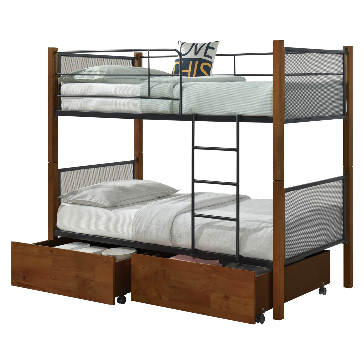 Σας παρουσιάζουμε τo κρεβάτι-κουκέτα RAYVEN σε συνδυασμό ξύλου- μετάλλου για μονά στρώματα 90×190εκ. Τα 4 πόδια-κολώνες του κρεβατιού είναι τα ξύλινα κομμάτια της σύνθεσης σε χρώμα ΚΑΡΥΔΙ, ενώ το κεφαλάρι, το ποδαρικό, τα πλαϊνά, η σκάλα, τα κάγκελα, και οι τάβλες στήριξης του στρώματος είναι όλα μεταλλικά σε ΜΑΥΡΟ χρώμα. Τα κεφαλάρια μάλιστα αποτελούνται από μεταλλική «σίτα», όπως και τα ποδαρικά. Η πρόσβαση στο επάνω κρεβάτι γίνεται με μια μεταλλική σκάλα που τοποθετείται βιδωτή στον σκελετό. Στο επάνω κρεβάτι υπάρχουν πλαϊνά προστατευτικά κάγκελα που προσφέρουν ασφάλεια από πτώσεις. Η πρακτικότητά του τονίζεται ακόμα περισσότερο χάρη στα δύο συρτάρια δαπέδου από MDF με ροδάκια, που τοποθετούνται κάτω από το κρεβάτι, και διαθέτουν όμορφη πρόσοψη μασίφ ξύλου σε χρώμα παρόμοιο με τον σκελετό του κρεβατιού. Ιδανικό τόσο για το σπίτι, όσο και για επαγγελματικούς χώρους, όπως AirBnB, ξενοδοχεία κτλ.