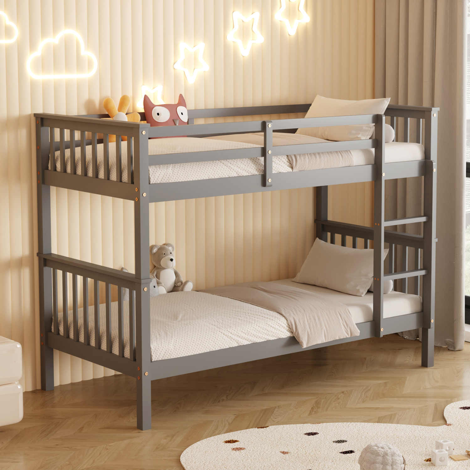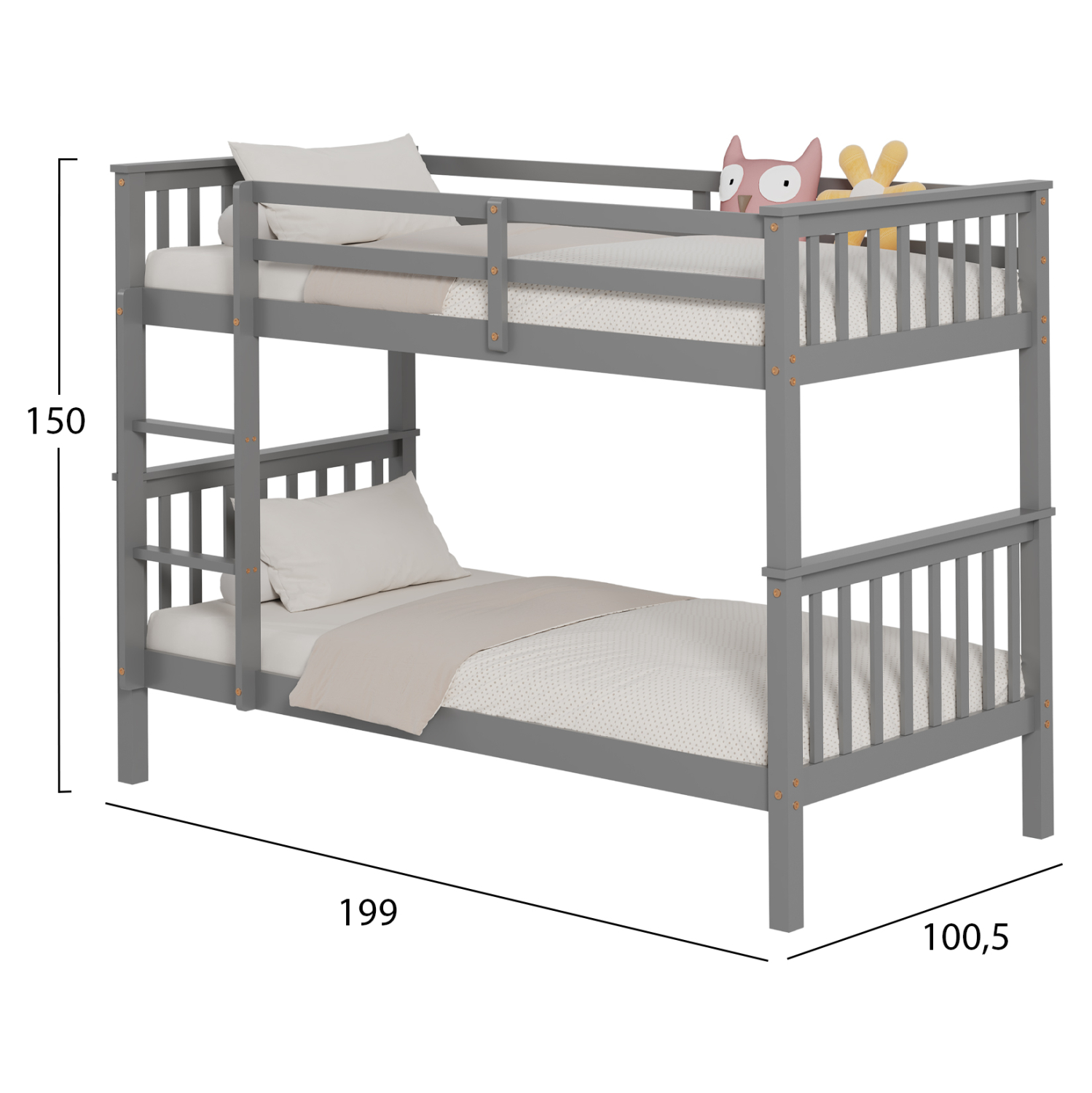Σας παρουσιάζουμε το «LANTAI» που είναι ένα καινούργιο διώροφο παιδικό κρεβάτι-κουκέτα. Τα κρεβάτια είναι σε διάσταση για μονό στρώμα 90×190 εκ, και αποτελεί μια άριστης ποιότητας, μοντέρνα και ασφαλή επιλογή για το παιδικό δωμάτιο. Η κουκέτα είναι ξύλινη σε ΓΚΡΙ χρώμα βαμμένο με αβλαβές βερνίκι με βάση το νερό και μη τοξικό, ιδανικό για παιδιά. Τα στρώματα τοποθετούνται σε τάβλες κατασκευασμένες από ξυλεία κόντρα πλακέ. Διαθέτει όμορφη σκάλα πρόσβασης στο επάνω κρεβάτι καθώς και κάγκελα προστασίας περιμετρικά στο επάνω κρεβάτι, ενώ τα πόδια είναι σχετικά ψηλά, αφήνοντας χώρο για αποθήκευση πραγμάτων και εύκολο καθάρισμα. Αυτό, όμως, που κάνει αυτή την κουκέτα να ξεχωρίζει είναι ότι σας δίνει την δυνατότητα να χρησιμοποιήσετε τα δύο κρεβάτια ξεχωριστά και όχι απαραίτητα ως κουκέτα!