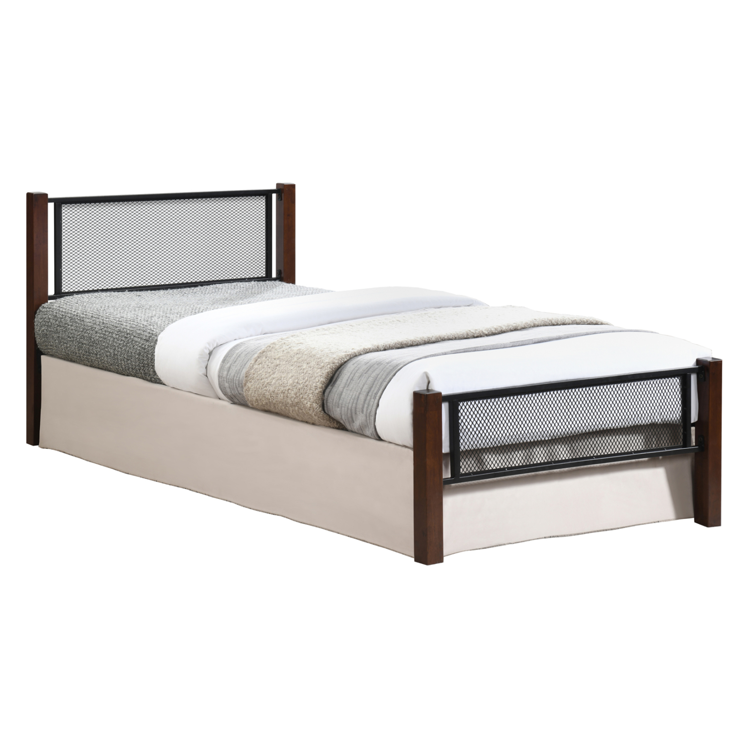 Το κρεβάτι RAYVEN είναι κατασκευασμένο από μέταλλο και ξύλο. Μπορεί άνετα να σταθεί και να συνδυαστεί με πληθώρα διακοσμητικών μοτίβων σε κάθε υπνοδωμάτιο. Τα 4 πόδια-κολώνες του κρεβατιού είναι τα ξύλινα κομμάτια της σύνθεσης σε χρώμα DIRTY OAK, ενώ το κεφαλάρι, το ποδαρικό, τα πλαϊνά, και οι τάβλες στήριξης του στρώματος είναι όλα μεταλλικά σε ΜΑΥΡΟ χρώμα. Το κεφαλάρι μάλιστα αποτελείται από μεταλλική «σίτα», όπως και το κοντό ποδαρικό που δεν ξεπερνάει σε ύψος το στρώμα σας. Ιδανικό τόσο για το σπίτι, όσο και για επαγγελματικούς χώρους, όπως AirBnB, ξενοδοχεία κτλ.