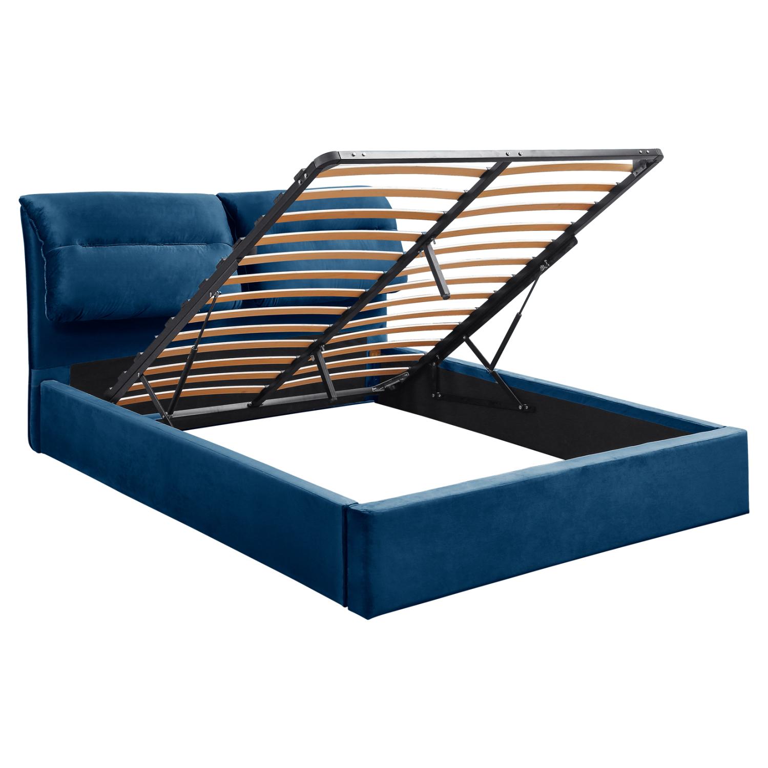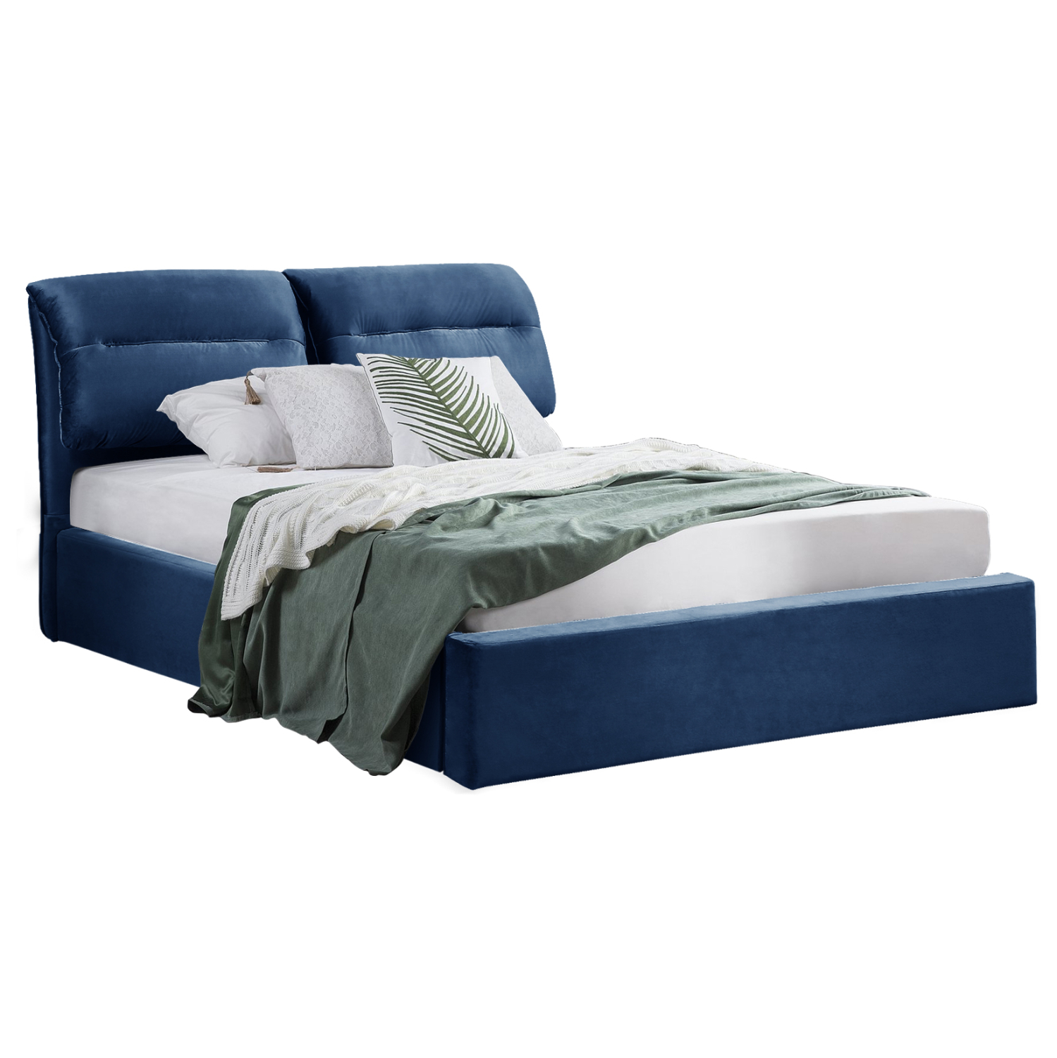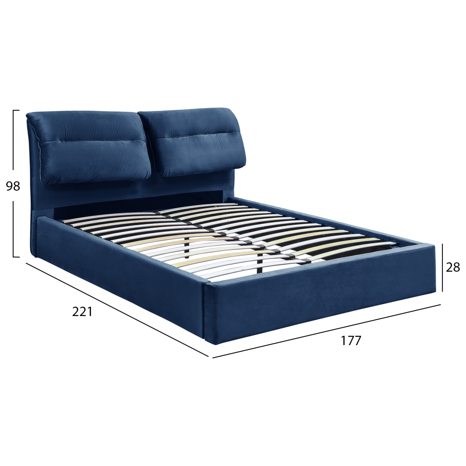 Σε διάσταση για στρώμα 160×200 εκ, είναι επαρκέστατα άνετο για να χωρέσουν δύο άτομα. Έχει κεφαλάρι με δύο μαξιλάρια δεμένα πάνω του (αποσπώμενα με φερμουάρ) για να προσφέρει άνεση όταν κάθεστε για να διαβάσετε το βιβλίο σας, ενώ ολόκληρη η επένδυσή του έχει γίνει με εξαιρετικής ποιότητας βελούδινο ύφασμα σε ΜΠΛΕ χρώμα. Το στρώμα «κάθεται» πάνω σε δύο σειρές από ανατομικές τάβλες, ακολουθώντας τον παραδοσιακό τρόπο κατασκευής κρεβατιού. Επιπλέον, το τελάρο με τις τάβλες στήριξης του στρώματος ανασηκώνεται (αφού πρώτα αφαιρέσετε το στρώμα) με μεταλλικό μηχανισμό ασφαλείας προσφέροντας έναν μεγάλο αποθηκευτικό χώρο, ο οποίος φυσικά καταλαμβάνει όλο τον χώρο μέχρι το δάπεδο.