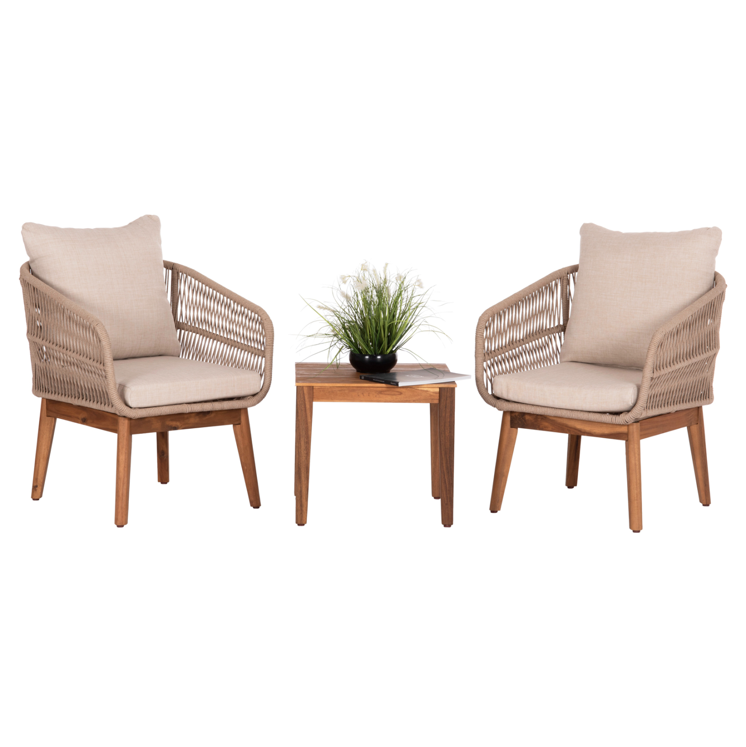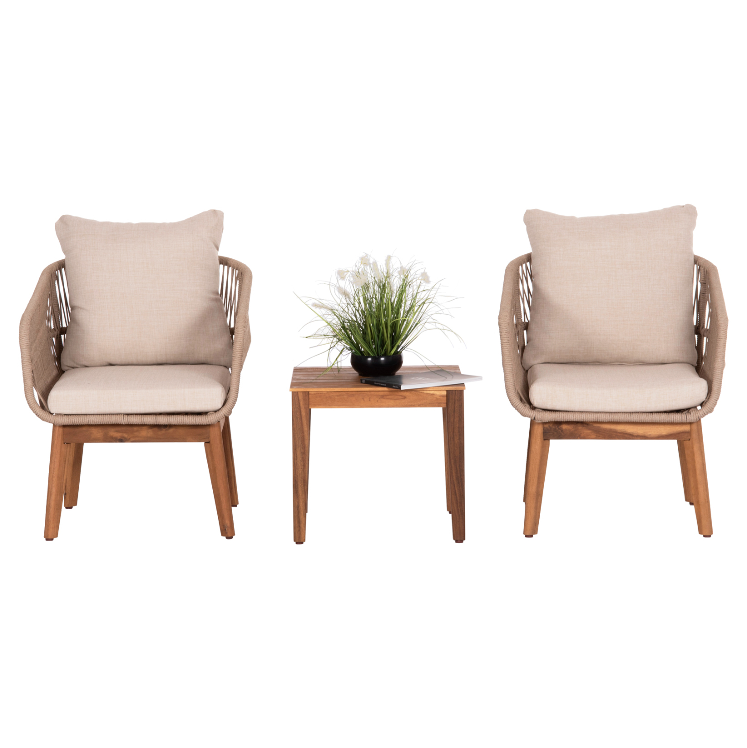 Σας παρουσιάζουμε το νέο σετ σαλονιού εξωτερικού χώρου RUTH που αποτελείται από 1 τετράγωνο τραπεζάκι και 2 πολυθρόνες. Το τραπεζάκι όπως και τα πόδια στις καρέκλες είναι από ξύλο ακακίας σε ΦΥΣΙΚΟ χρώμα, ενώ ο σκελετός των καθισμάτων στις πολυθρόνες είναι μεταλλικός επενδυμένος με σχοινί σε ΜΠΕΖ χρώμα! Τα μαξιλάρια είναι επενδυμένα με πολυεστερικό ύφασμα, κατάλληλο για εξωτερικούς χώρους, σε ΜΠΕΖ χρώμα και διαθέτουν γέμισμα με μέτριας σκληρότητας αφρώδη υλικά για την μεγαλύτερη δυνατή άνεση, αλλά και φερμουάρ. Αυτό το σετ είναι ιδανικό για μπαλκόνια και γενικά για μικρούς χώρους.