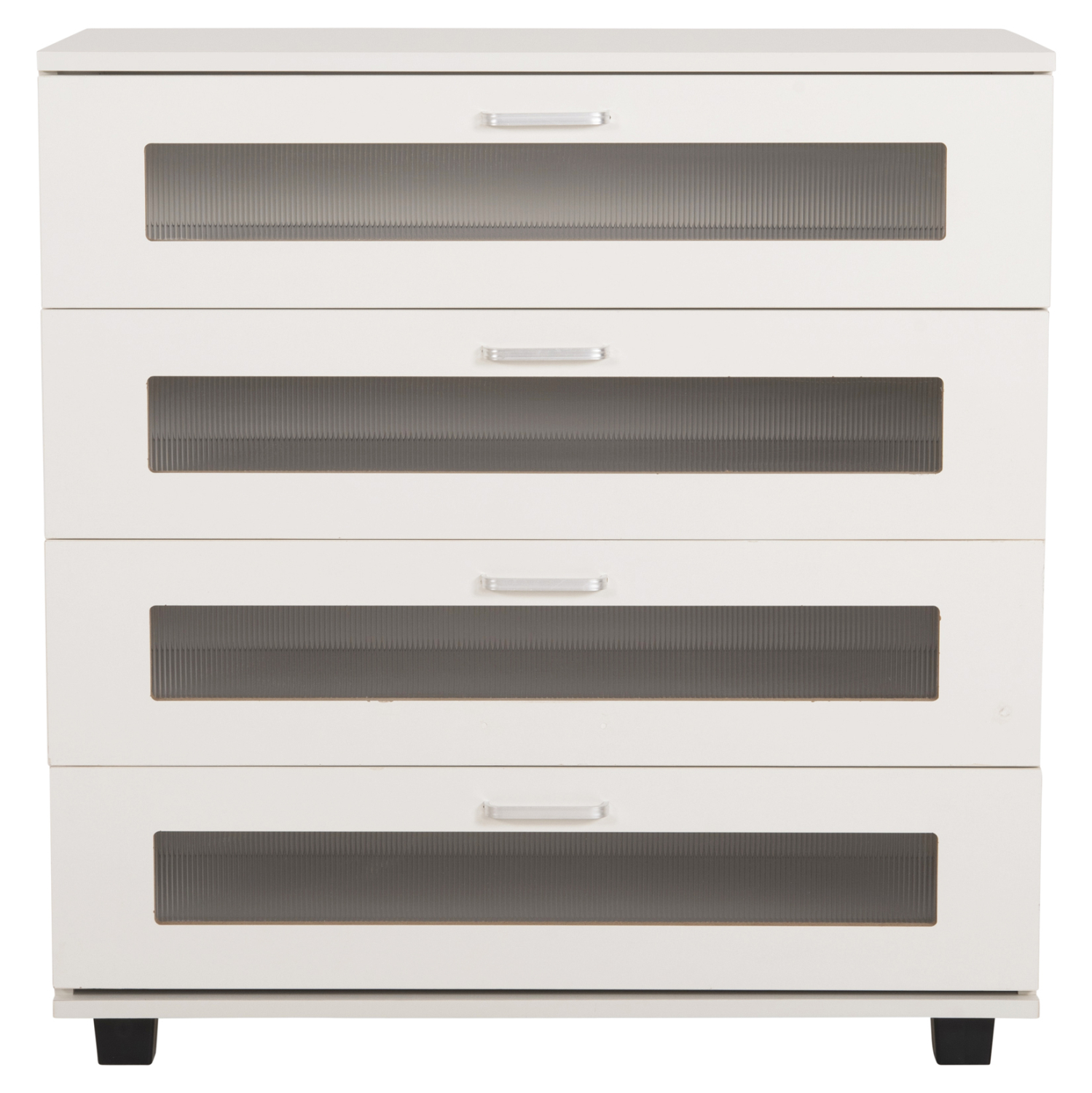 Η THORGAN είναι μια μεγάλη συρταριέρα με 4 φαρδιά συρτάρια που θα ικανοποιήσει όλες τις ανάγκες σας. Έχει ουδέτερο χρώμα ΛΕΥΚΟ με χερούλια σε ασημί απόχρωση. To χαρακτηριστικό που κάνει αυτή την συρταριέρα να ξεχωρίζει είναι ότι τα συρτάρια έχουν παραθυράκια από ημιδιαφανές πολυκαρβονικό γυαλί. Τα μαύρα ποδαράκια της συρταριέρας, είναι σταθερά και φαρδιά προσφέροντας στιβαρότητα στην κατασκευή και ταυτόχρονα δημιουργούν μια ευχάριστη διχρωμία με το κυρίως σώμα της συρταριέρας.