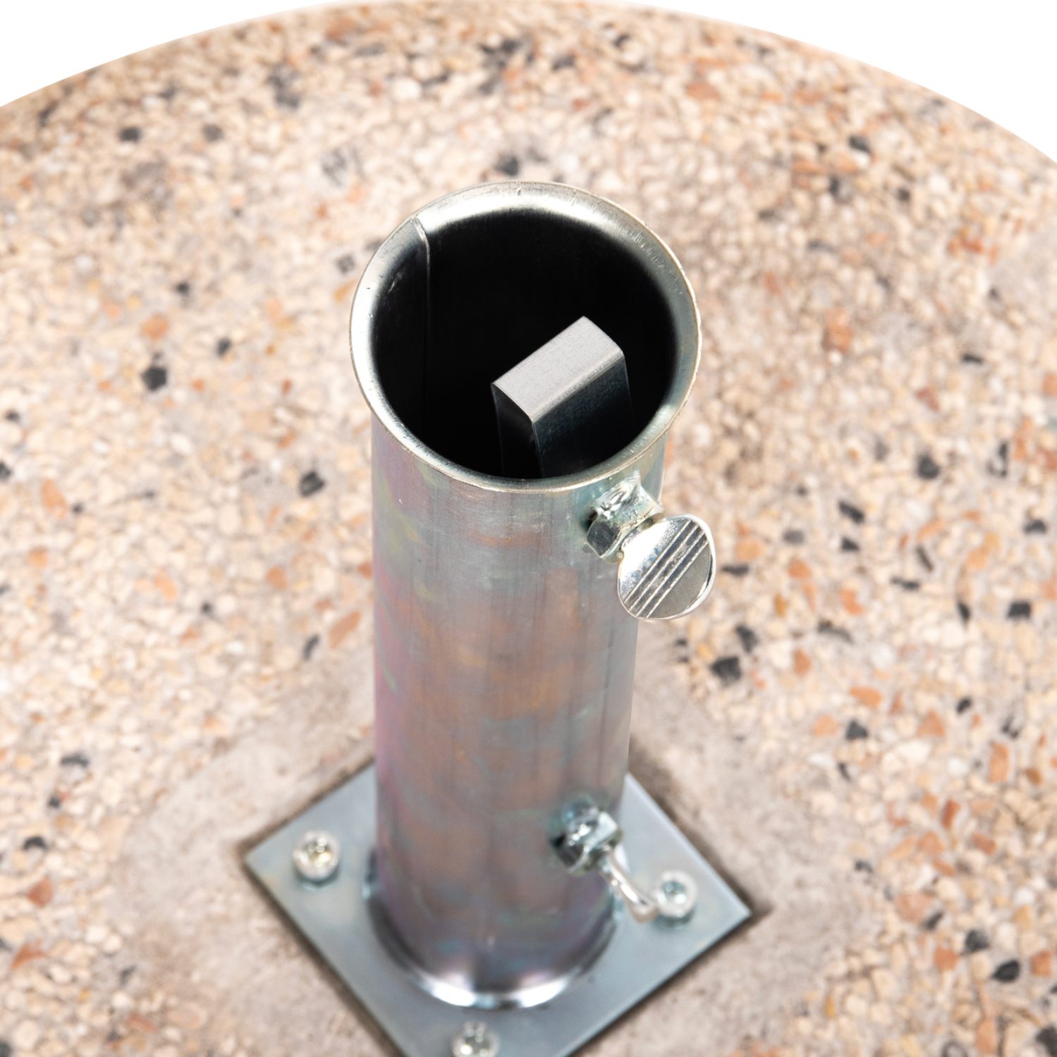 Πρόκειται για μια τσιμεντένια κυκλική βάση για ομπρέλες με σωλήνα διαμέτρου Φ62. Το χαρακτηριστικό αυτής της έκδοσης είναι ότι η σωλήνα υποδοχής της ομπρέλας βιδώνεται στην βάση με 4 βίδες βαρέως τύπου προσδίδοντας απαράμιλλη σταθερότητα και στιβαρότητα. Τέλος, διαθέτει χερούλια μεταφοράς πράγμα το οποίο σας διευκολύνει αρκετά σε περίπτωση που χρειαστεί να την μετακινήσετε.