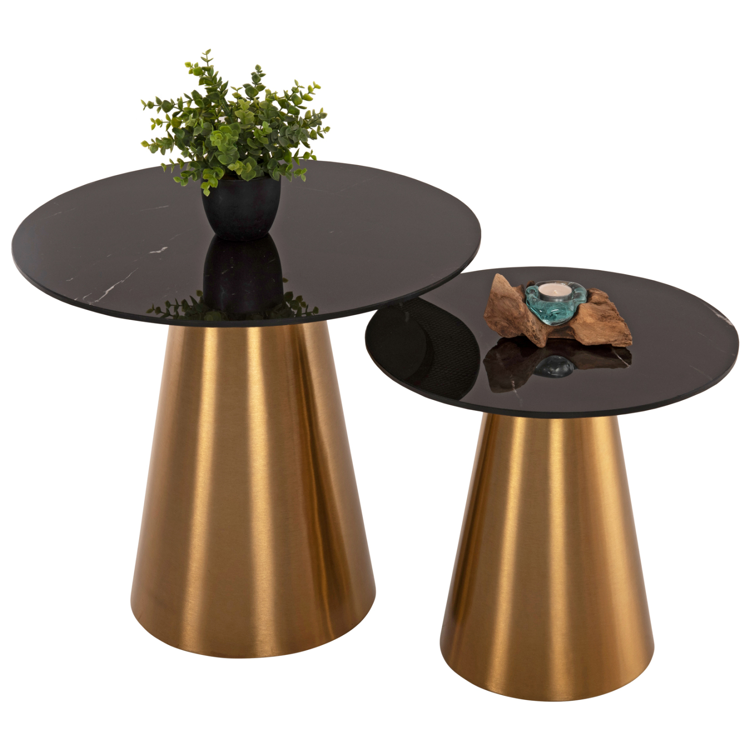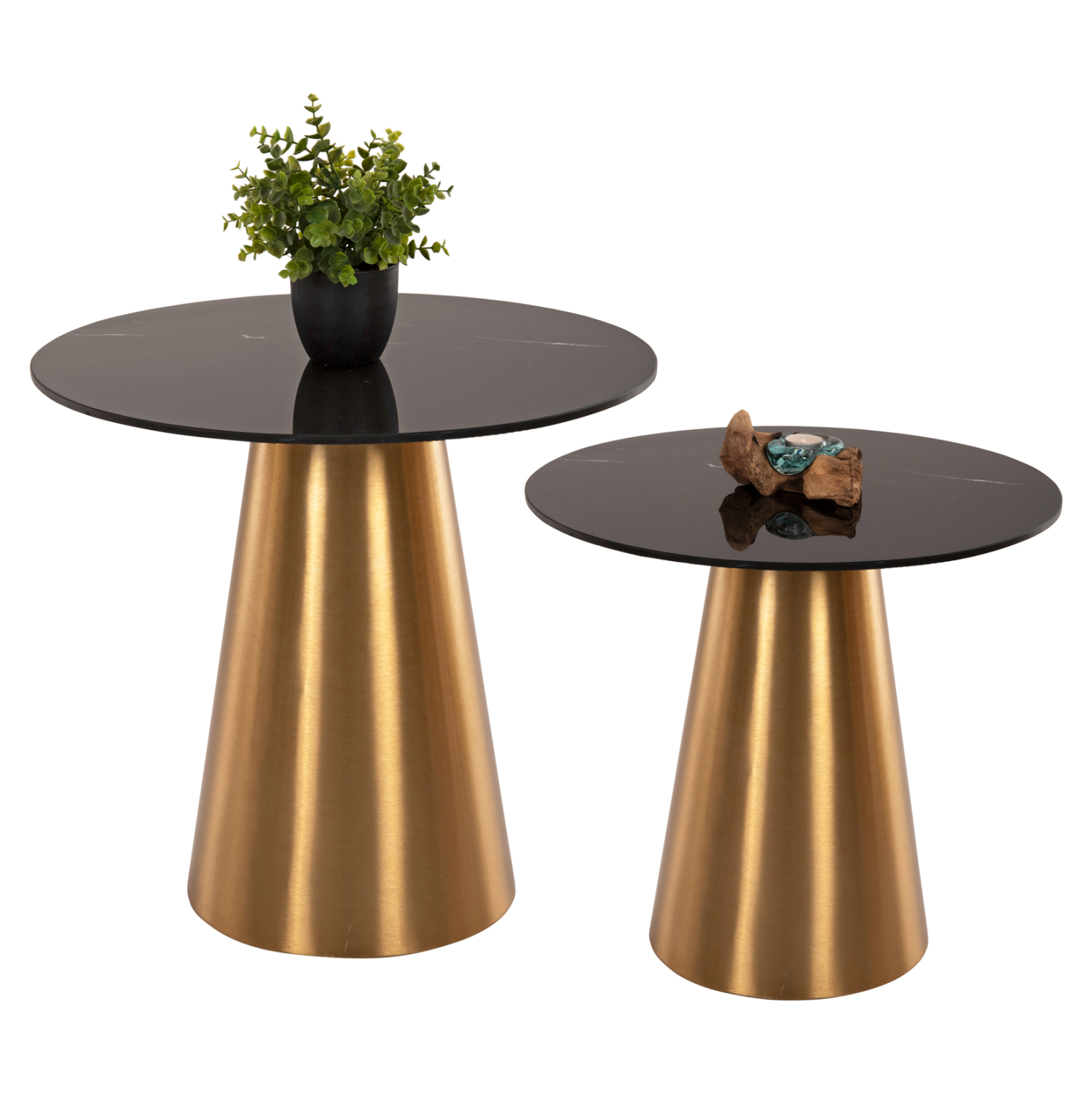 Το σετ 2 τραπεζιών RENGI για το σαλόνι είναι μια από τις νέες προσθήκες στην γκάμα μας. Πρόκειται για 2 τραπεζάκια στρογγυλά με κωνική βάση και μεταλλικά. Το χρώμα τους είναι ΧΡΥΣΟ. Οι επιφάνειες είναι κεραμικές, σε μαύρο χρώμα. Ιδανικά τόσο για το σπίτι, όσο και για επαγγελματικούς χώρους.