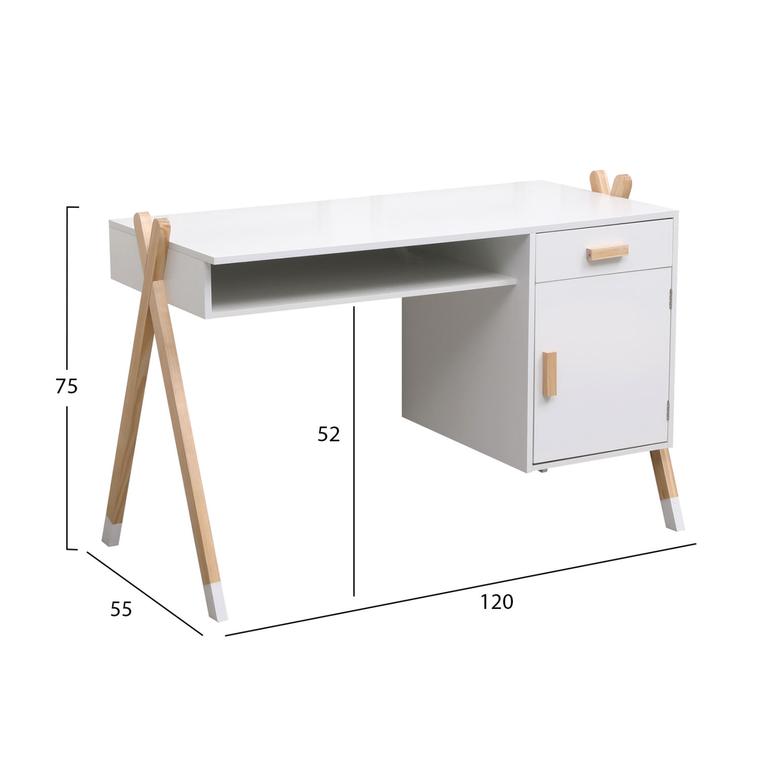 Το νέο παιδικό γραφείο PASCHAL σε ΛΕΥΚΟ χρώμα ήρθε για να αποτελέσει την καλύτερη λύση για το παιδικό δωμάτιο. Είναι βολικό σε διαστάσεις και διαθέτει έναν ανοιχτό αποθηκευτικό χώρο, ένα συρτάρι κι ένα ντουλαπάκι. Στηρίζεται σε δύο ξύλινα χιαστί πόδια σε ΦΥΣΙΚΟ χρώμα ξύλου στις δύο πλευρές. Είναι βαμμένο με αβλαβές μη τοξικό βερνίκι με βάση το νερό, ιδανικό για παιδιά.