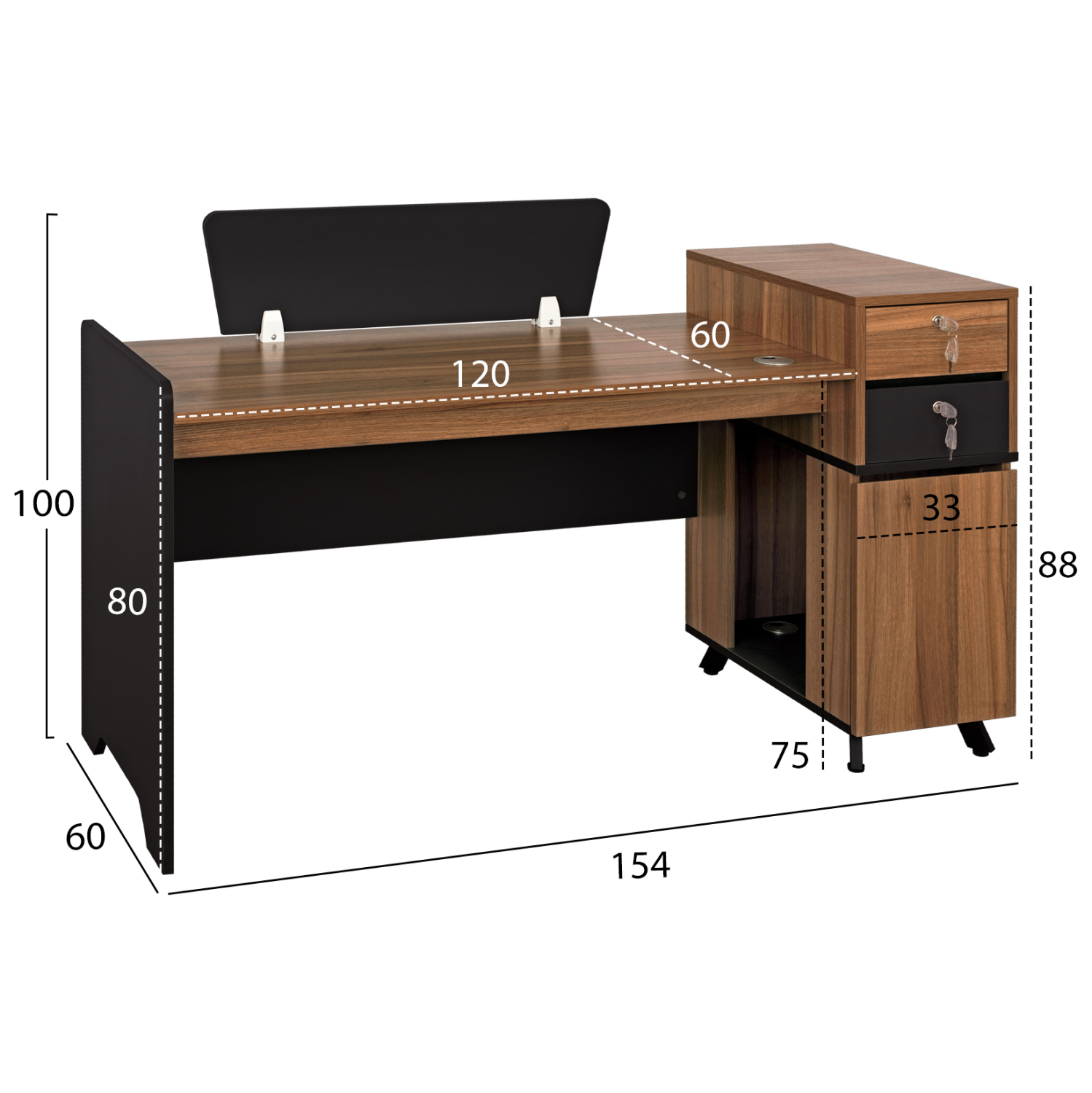 Διαθέτει ντουλάπι με μία πόρτα, δύο συρτάρια με κλειδαριά και έναν ανοιχτό αποθηκευτικό χώρο.