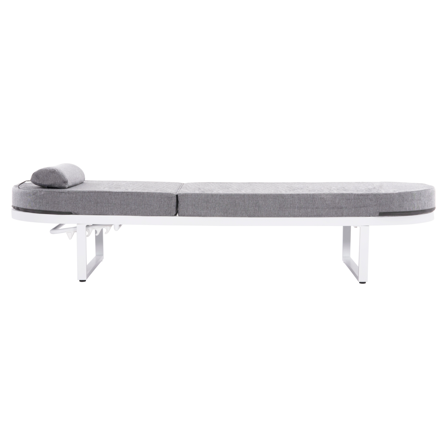 Η επαγγελματική ξαπλώστρα παραλίας MALLOW σε ΛΕΥΚΟ χρώμα είναι στιβαρή και πολυτελής. Είναι κατασκευασμένη από αλουμίνιο και γαλβανιζέ μέταλλο στο εσωτερικό του σκελετού για έξτρα ανθεκτικότητα, και διαθέτει ψηλό μαξιλάρι(στρώμα) με προσκέφαλο σε ΓΚΡΙ χρώμα. Σχεδιαστικά οι «γραμμές» της είναι ξεκάθαρες σε ΟΒΑΛ υλοποίηση. Η σκαλιέρα έχει 5 επίπεδα (μαζί με την flat).