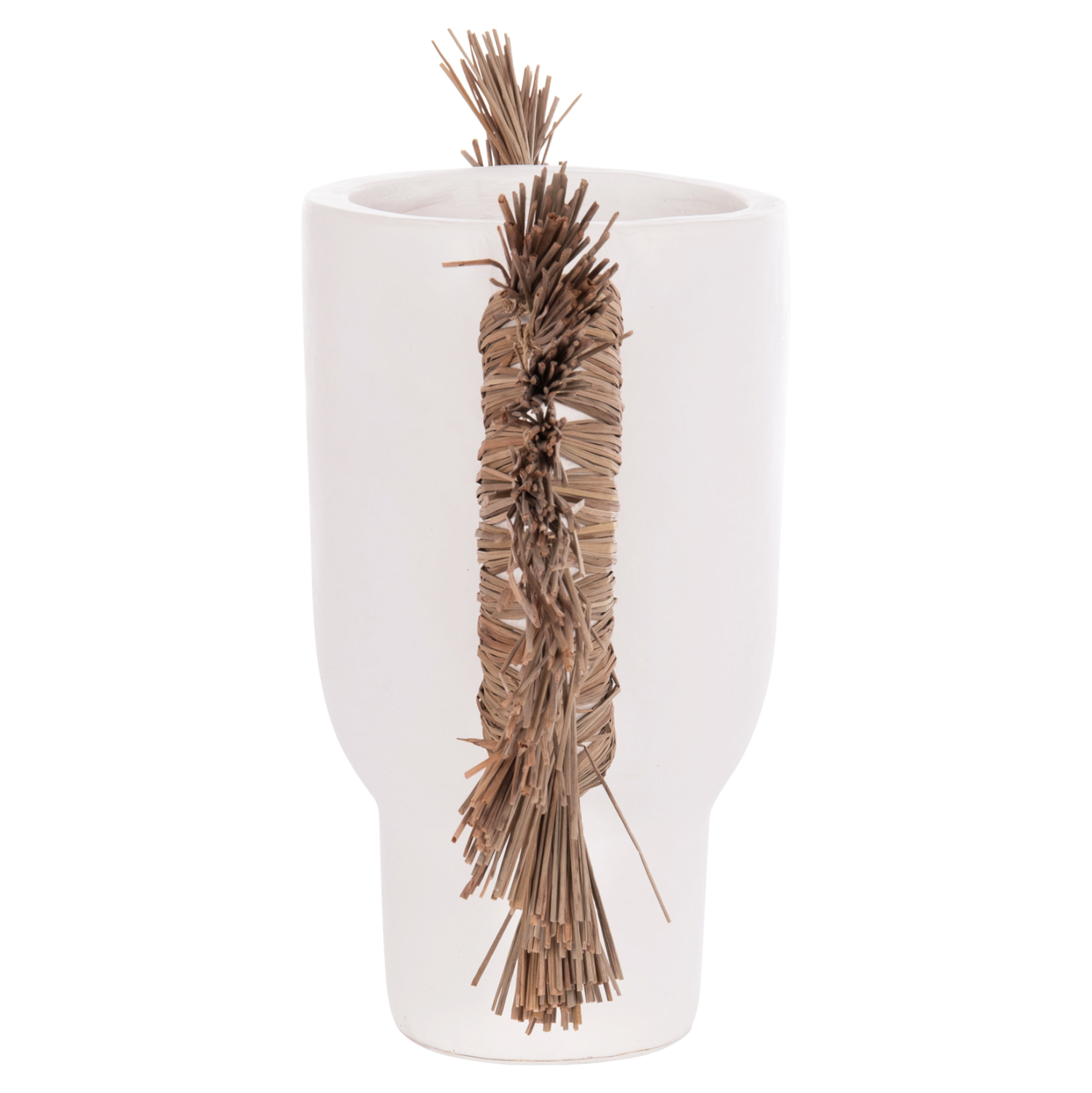 Το επιτραπέζιο χειροποίητο διακοσμητικό βάζο ALICA είναι ένα πολύ ιδιαίτερο διακοσμητικό στοιχείο για κάθε χώρο. Είναι κατασκευασμένο εξολοκλήρου από τερακότα σε ΛΕΥΚΟ χρώμα, ενώ διαθέτει και δύο χερούλια επενδυμένα με αποξηραμένο grass, και ένα φαρδύ στόμιο.