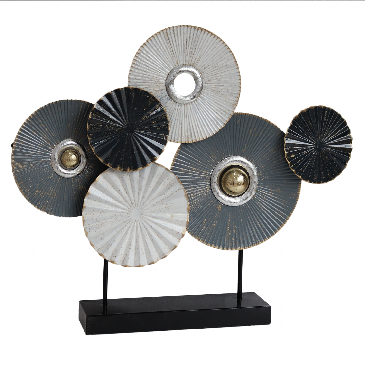 Μεταλλικό επιτραπέζιο διακοσμητικό σε μαύρη και γκρι απόχρωση με λευκές και χρυσές πινελιές και βάση σε μαύρο χρώμα.