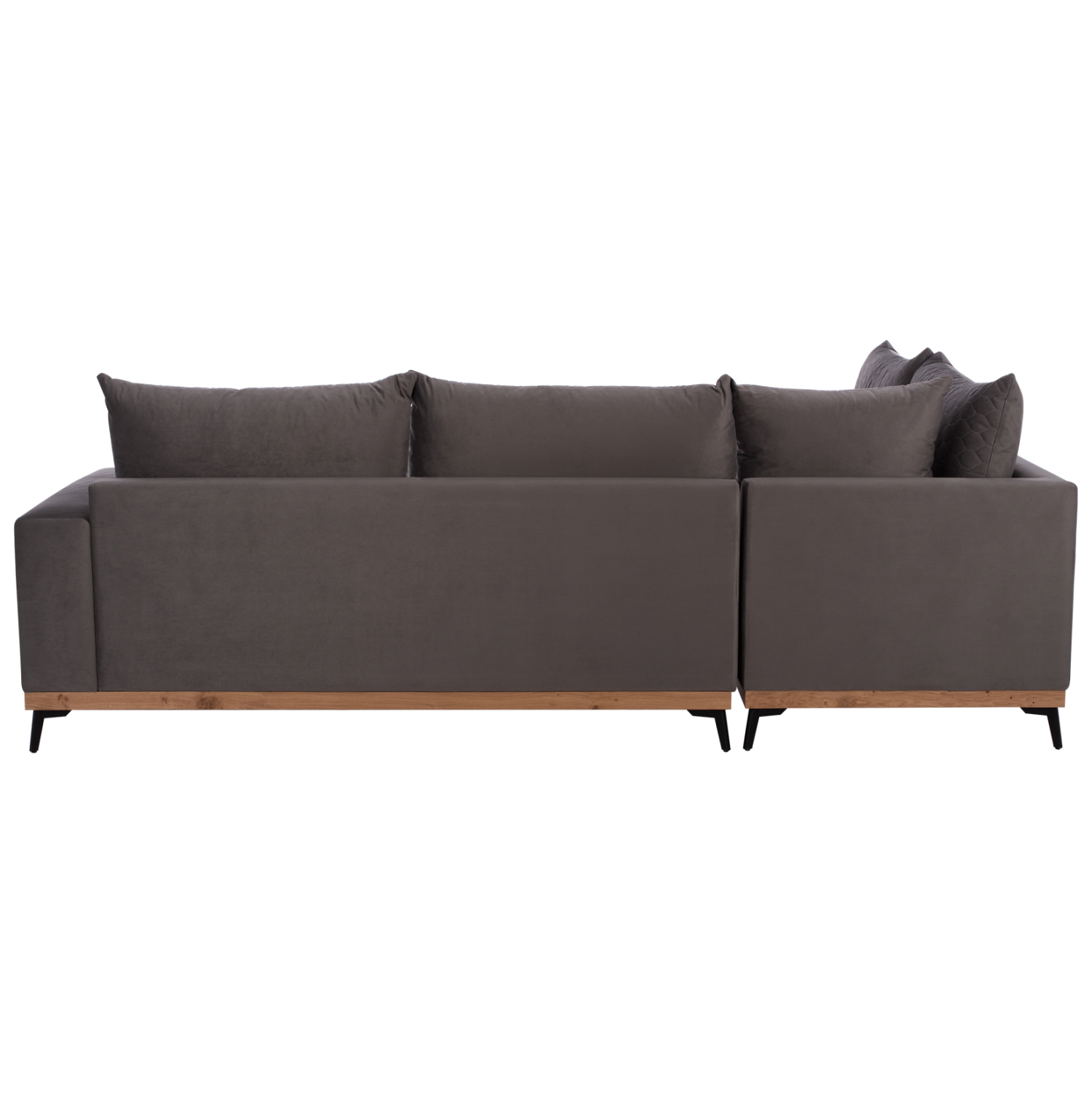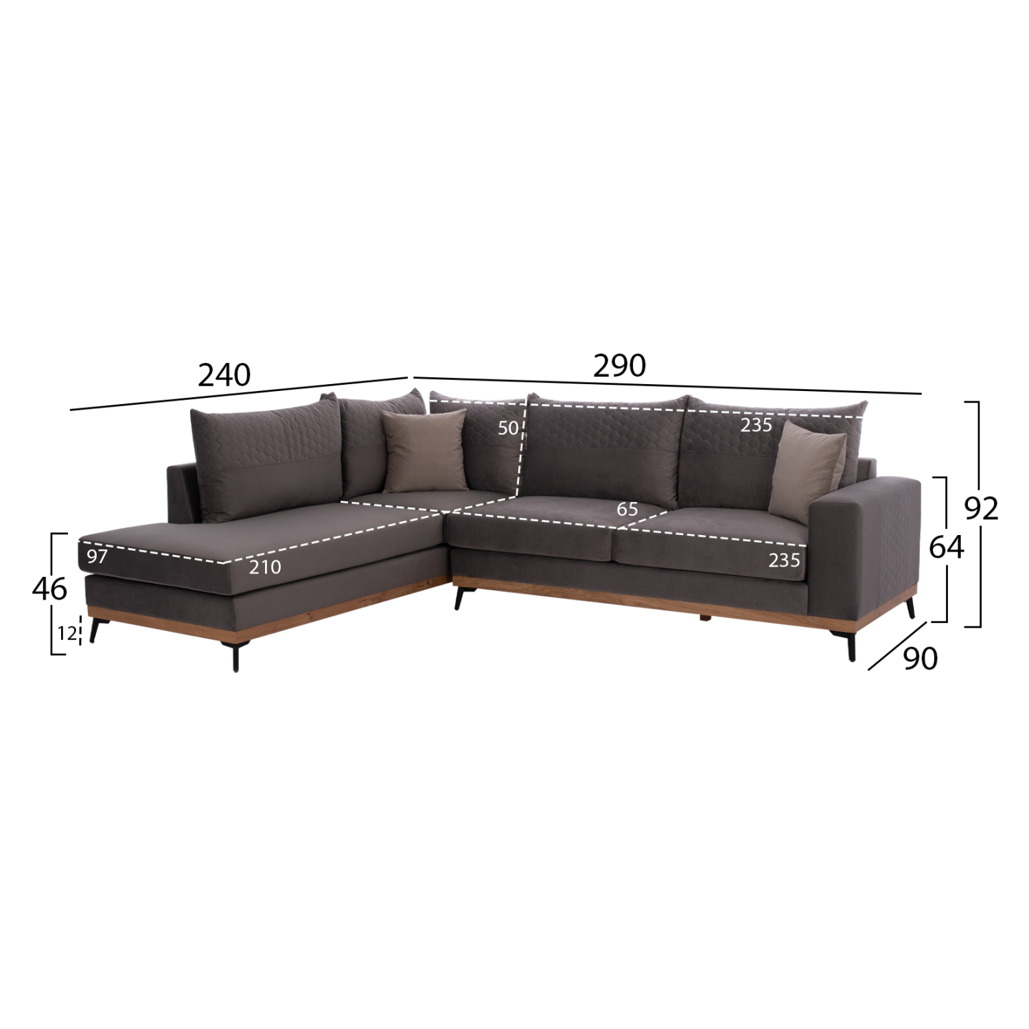 Ξεκινώντας από τα βασικά και τα προφανή, το χρώμα της βελούδινης επένδυσης του μεγάλου αυτού καναπέ είναι SAHARA 13- γκρι. Διαθέτει 5 μαξιλάρια πλάτης στο ίδιο χρώμα και δύο μικρότερα διακοσμητικά μαξιλάρια σε SAHARA 16- ανοιχτό γκρι χρώμα. Τα 4 μαξιλάρια καθίσματος σε συνδυασμό με αυτά της πλάτης, δίνουν την τέλεια αίσθηση άνεσης! Τα μαξιλάρια πλάτης έχουν τεχνοτροπία καπιτονέ κατά το ήμισυ, όπως υπάρχει και μια πανέμορφη καπιτονέ λωρίδα στο μεγάλο μπράτσο. Τα μαξιλάρια στο πίσω μέρος τους, έχουν πιο ανοιχτό γκρι χρώμα, ενώ ακόμα πιο ανοιχτό είναι το χρώμα των δύο μικρών διακοσμητικών μαξιλαριών. Το μεγάλο μαξιλάρι καθίσματος που σχηματίζει την γωνία δεν θα δυσκολέψει τον χρήστη φεύγοντας από την θέση του, επειδή διαθέτει «χρατς» και κολλάει στην ειδική επιφάνεια του σκελετού. Το κομμάτι που δημιουργεί την αριστερή γωνία, είναι κουμπωτό και συνδέεται με τον υπόλοιπο καναπέ αρμονικά με ενισχυμένους γαλβανιζέ αναρτήρες πάνελ (κατακόρυφα συρταρωτά) για τεράστια αντοχή και ευκολία στην χρήση.