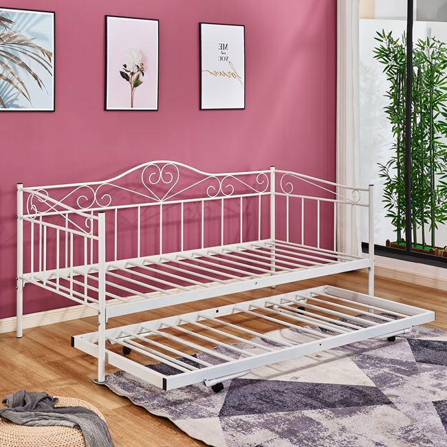 Πρόκειται για μια αμιγώς μεταλλική κατασκευή σε ΛΕΥΚΟ χρώμα που θα κινήσει το ενδιαφέρον. Μπορεί άνετα να σταθεί και να συνδυαστεί με πληθώρα διακοσμητικών μοτίβων σε κάθε χώρο. Η πλάτη είναι μεταλλική με όμορφα μεταλλικά σχέδια ενώ και τα μπράτσα είναι παρόμοιας αισθητικής. Είναι τόσο υπέροχα πρακτικό που μπορείτε να περάσετε όλη την ημέρα σε αυτό. Αυτό όμως που κάνει αυτόν τον μονό κρεβατοκαναπέ να ξεχωρίζει είναι ότι διαθέτει και ένα ανεξάρτητο πτυσσόμενο (συρόμενο) μικρότερο κρεβάτι, που βγαίνει με ροδάκια κάτω από τον καναπέ.
