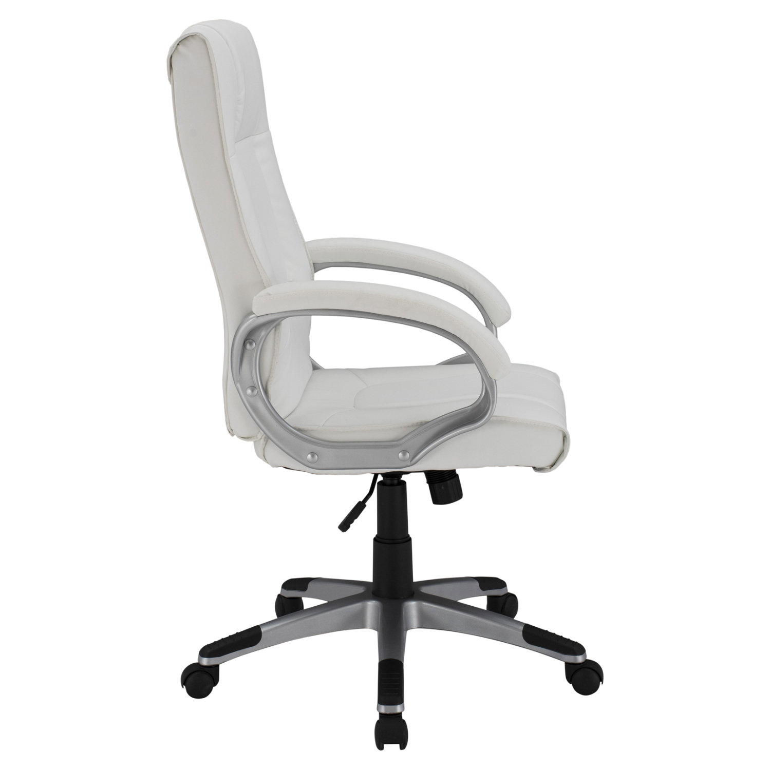 Διευθυντική καρέκλα γραφείου “CHANDER” σε λευκό χρώμα. Μια «πλούσια» καρέκλα γραφείου με ψηλά μπράτσα με κλίση και επενδυμένα με μια λεπτή στρώση αφρολέξ σε PU δέρμα. Η πλάτη είναι ψηλή με πλούσια στρώση από αφρώδη υλικά για άνεση κατά την χρήση και υποστηρίζει ολόκληρο τον κορμό σας, ενώ είναι επενδυμένη με υψηλής ποιότητας PU δέρμα , όπως επίσης και το φαρδύ και αναπαυτικό κάθισμα με την αναπαυτική επιφάνεια. Η βάση είναι ασημί σε σχήμα «αστέρι» με μαύρες λεπτομέρειες στο τελείωμα.