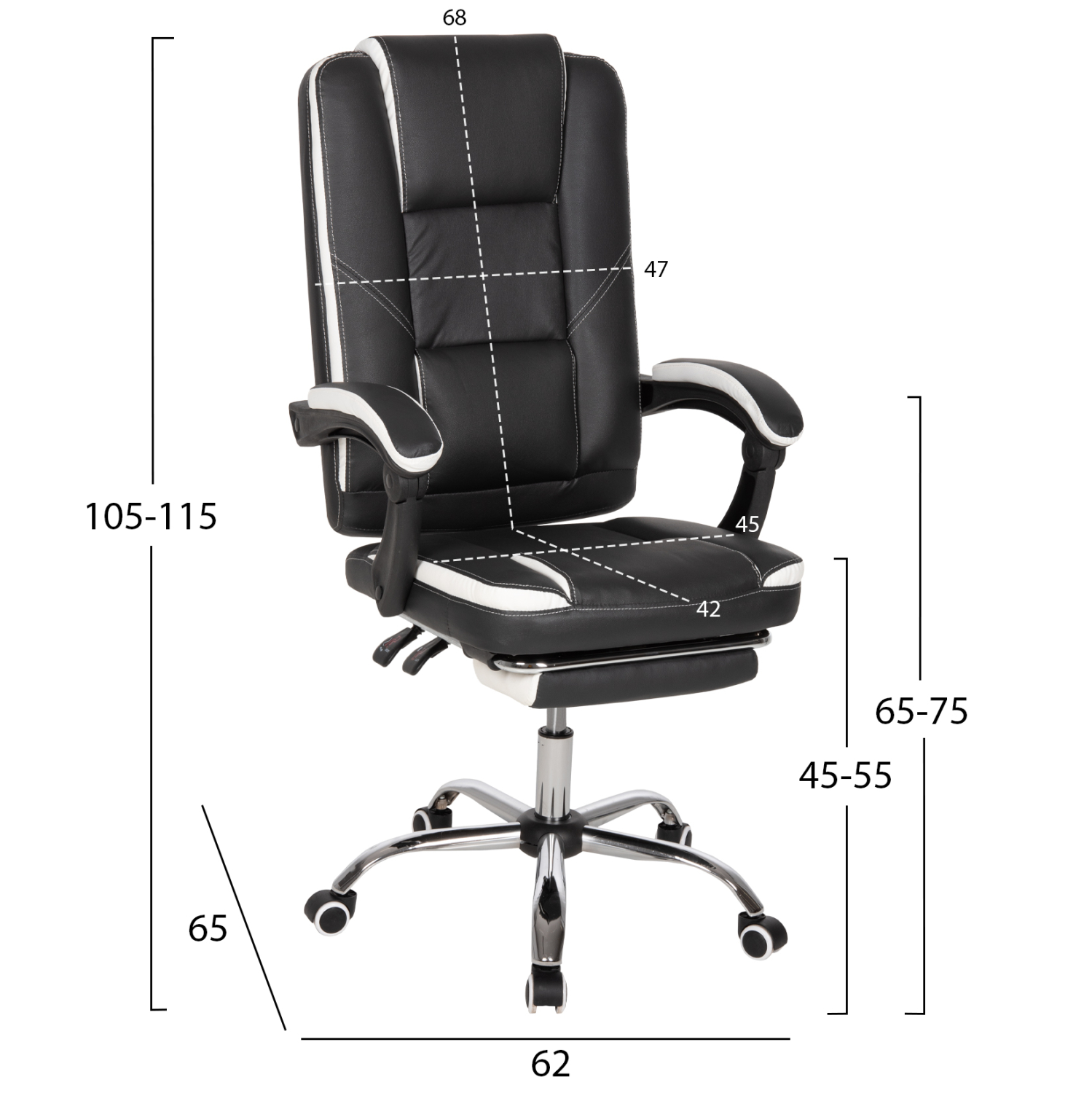 Η καρέκλα γραφείου SEENA σε ΜΑΥΡΟ και ΛΕΥΚΟ χρώμα θα σας ενθουσιάσει. Επιβλητική στην όψη θα προκαλέσει τον θαυμασμό όλων όσων την κοιτάξουν. Πολύ περισσότερο βέβαια, θα την ευχαριστηθείτε εσείς που θα την χρησιμοποιείτε ατέλειωτες ώρες δουλεύοντας στο γραφείο σας. Πρόκειται για μια καρέκλα με ψηλή πλάτη έτσι ώστε να προστατεύεις τον κορμό σου από τραυματισμούς και πιασίματα και να του προσφέρεις μοναδική στήριξη. Το πλούσιο «γέμισμα» με αφρώδη υλικά τόσο στο κάθισμα και τα μπράτσα, όσο και στην πλάτη αλλά και στην περιοχή του κεφαλιού, θα σε κάνουν να μην νιώσεις καθόλου κούραση ακόμα και μετά από ατελείωτες ώρες μπροστά στον υπολογιστή. Κι αν κάποια στιγμή θέλεις να κάνεις ένα διάλειμμα και να κοιμηθείς, ή απλά να συνεχίσεις την ολονυχτία σου ξαπλωμένος χρησιμοποιώντας τα ασύρματα gadget σου, η πλάτη της καρέκλας «πέφτει» και σε συνδυασμό με το πτυσσόμενο υποπόδιο, σου δίνει την δυνατότητα να εκμεταλλευτείς το κάθε δευτερόλεπτο! Οι ρυθμίσεις ύψους και ανάκλισης, μέσω δύο καλαίσθητων μοχλών, είναι φυσικά στον…στάνταρ εξοπλισμό, ενώ η πλάτη μπορεί να ανεβαίνει και να κατεβαίνει ολόκληρη μέσω ενός περιστροφικού ρεγουλατόρου!
