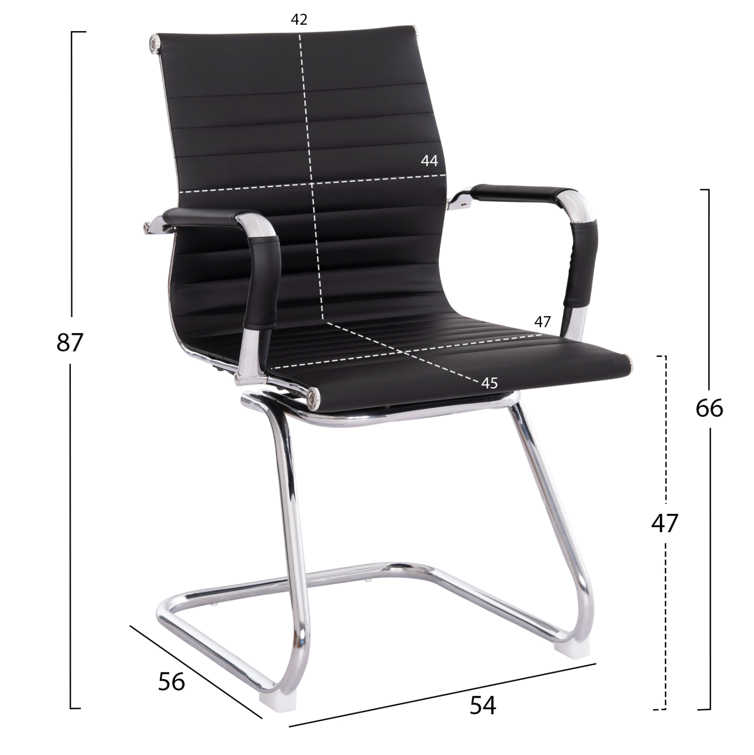 Η καρέκλα επισκέπτη/συνεργασίας BOSS θα τραβήξει όλα τα βλέμματα! Οι λεπτές μεταλλικές και ανατομικές καμπύλες της και ο συνδυασμός του ΜΑΥΡΟΥ PU δέρματος με τις οριζόντιες ραφές, με τα μεταλλικά χρωμιωμένα μέρη θα προκαλέσει τον θαυμασμό και μόνο. Τα μπράτσα είναι και αυτά ντυμένα με ΜΑΥΡΟ PU δέρμα. Η πλάτη είναι αναπαυτική και τετραγωνισμένη ενώ το κάθισμα είναι επίπεδο.