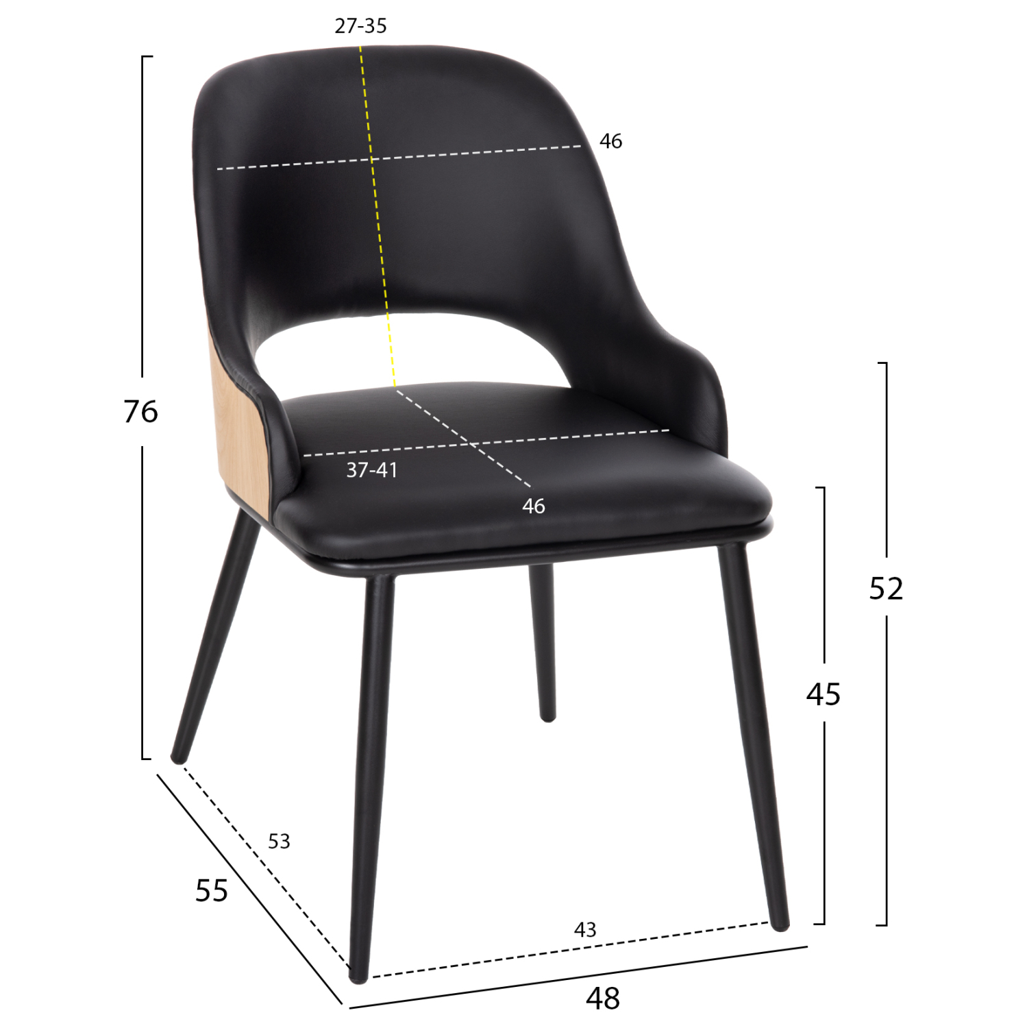 Καρέκλα DELF σε ΜΑΥΡΗ απόχρωση με ξύλινη πλάτη σε ΦΥΣΙΚΟ χρώμα ξύλου, και ΜΑΥΡΑ μεταλλικά πόδια. Η ξύλινη πλάτη είναι κυρτή και αναπαυτική. Μια καρέκλα που δίνει αέρα πολυτέλειας σε οποιοδήποτε χώρο. Ποιοτική και κομψή σίγουρα θα τραβήξει τα βλέμματα.