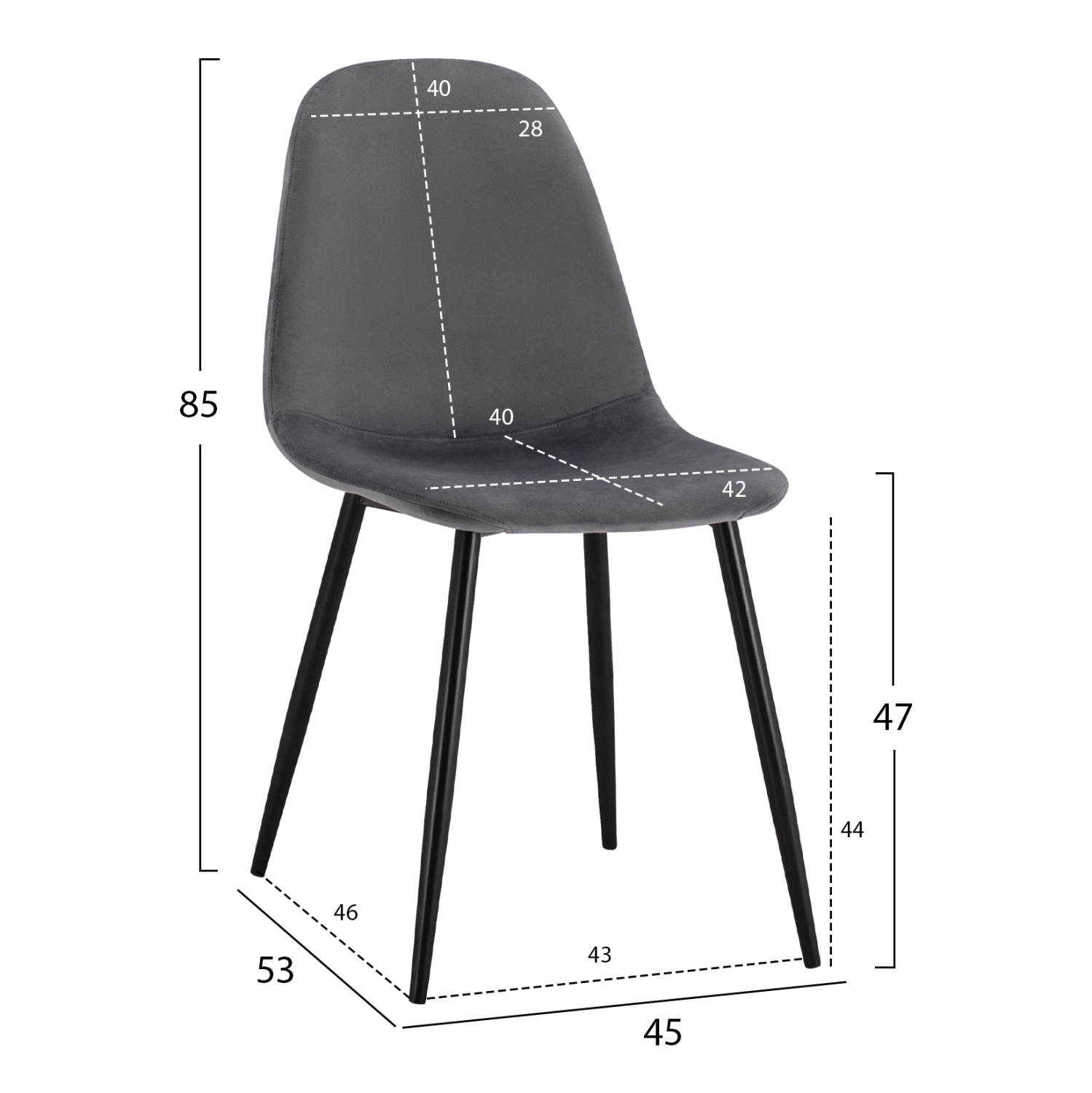 Η καρέκλα LEONARDO είναι επενδυμένη με ύφασμα βελούδο σε γκρι απόχρωση ενώ τα πόδια είναι μεταλλικά σε μαύρη απόχρωση για μεγαλύτερη αντοχή.
