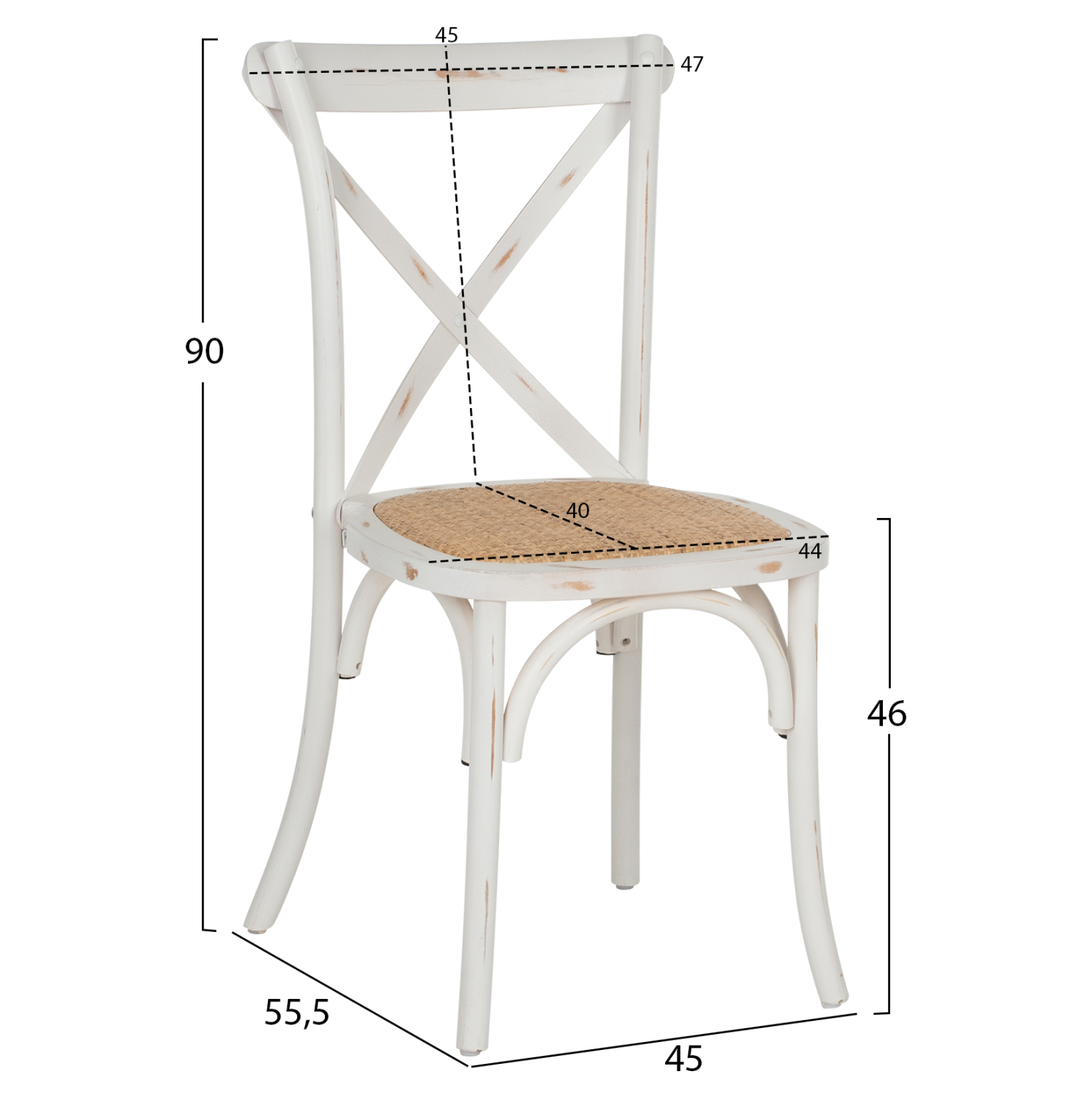 Η καρέκλα είναι κατασκευασμένη από υψηλής αντοχής ξύλο οξιάς σε white wash απόχρωση, ενώ το κάθισμα της καρέκλας είναι από ψάθα με χειροποίητη πλέξη.