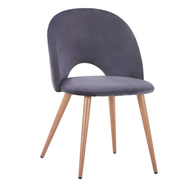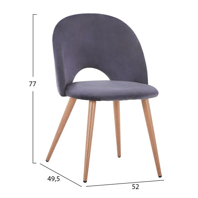 Καρέκλαι SADIE επενδυμένη με βελούδο σε γκρι απόχρωση. Τα πόδια είναι μεταλλικά, βαμμένα έτσι ώστε να αποδίδουν την όψη του ξύλου.