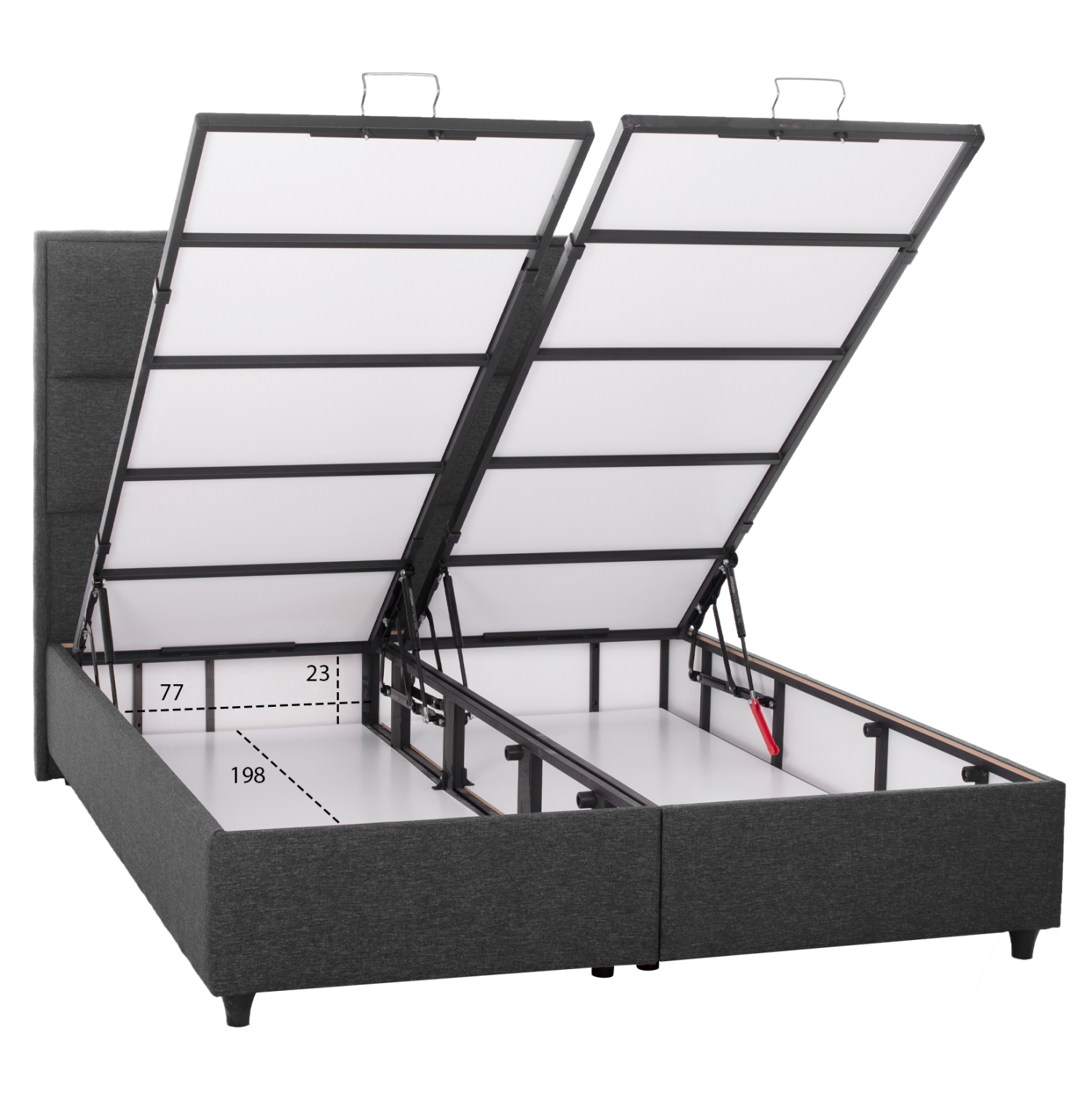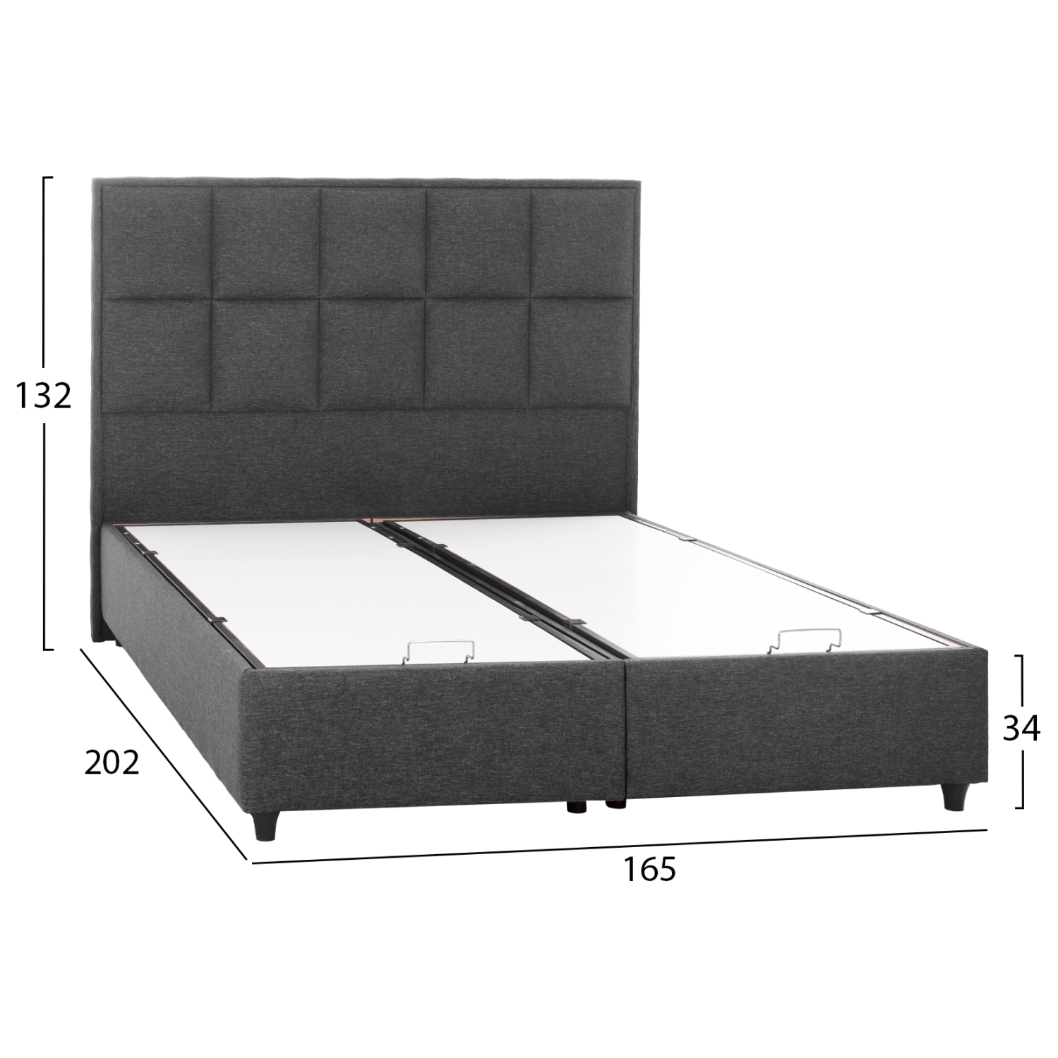 Το κρεβάτι ALBA έχει ψηλό κεφαλάρι, επενδυμένο με τετραγωνισμένη καπιτονέ τεχνοτροπία, ενώ και όλη η επένδυση του κρεβατιού είναι από εξαιρετικής ποιότητας ύφασμα. Το ΓΚΡΙ χρώμα σε όλο το κρεβάτι είναι εντυπωσιακό και μπορεί να συνδυαστεί με πληθώρα διακοσμητικών μοτίβων. Όμως, το κύριο χαρακτηριστικό αυτού του κρεβατιού είναι ότι δεν ακολουθεί την κλασική κατασκευή με τις τάβλες του σομιέ για την στήριξη του στρώματος, αλλά αντίθετα αποτελείται από μια συνεχόμενη επιφάνεια (2 μοριοσανίδες) πάνω στην οποία τοποθετείται το στρώμα. Επιπλέον, η κάθε επιφάνεια από μοριοσανίδα ανασηκώνεται με μεταλλικό μηχανισμό ασφαλείας με 4 αμορτισέρ και μεταλλικές λαβές προσφέροντας έναν μεγάλο αποθηκευτικό χώρο. Σε διαστάσεις στρώματος 160×200 εκ. θα χωρέσει κάθε σας όνειρο!