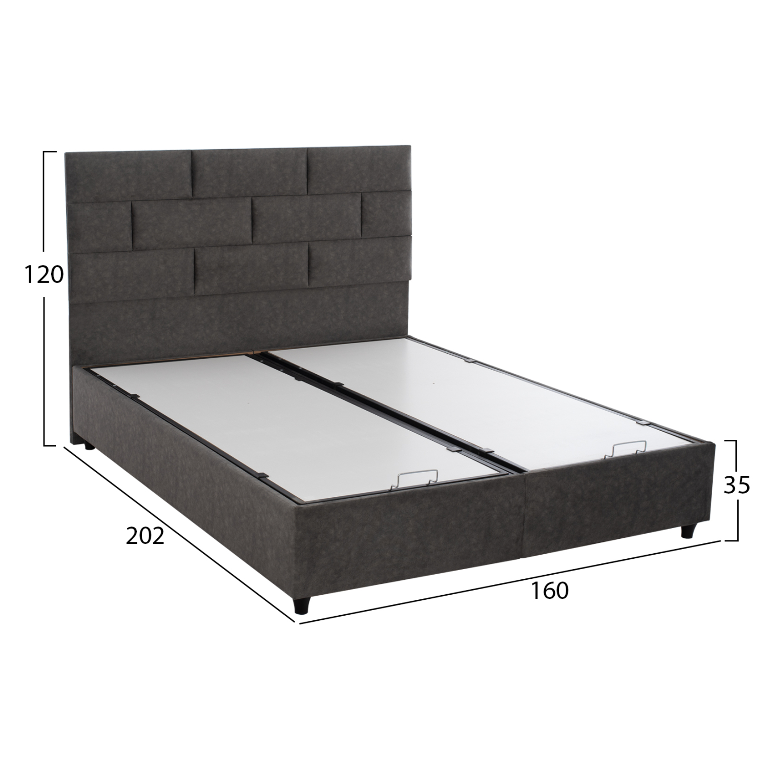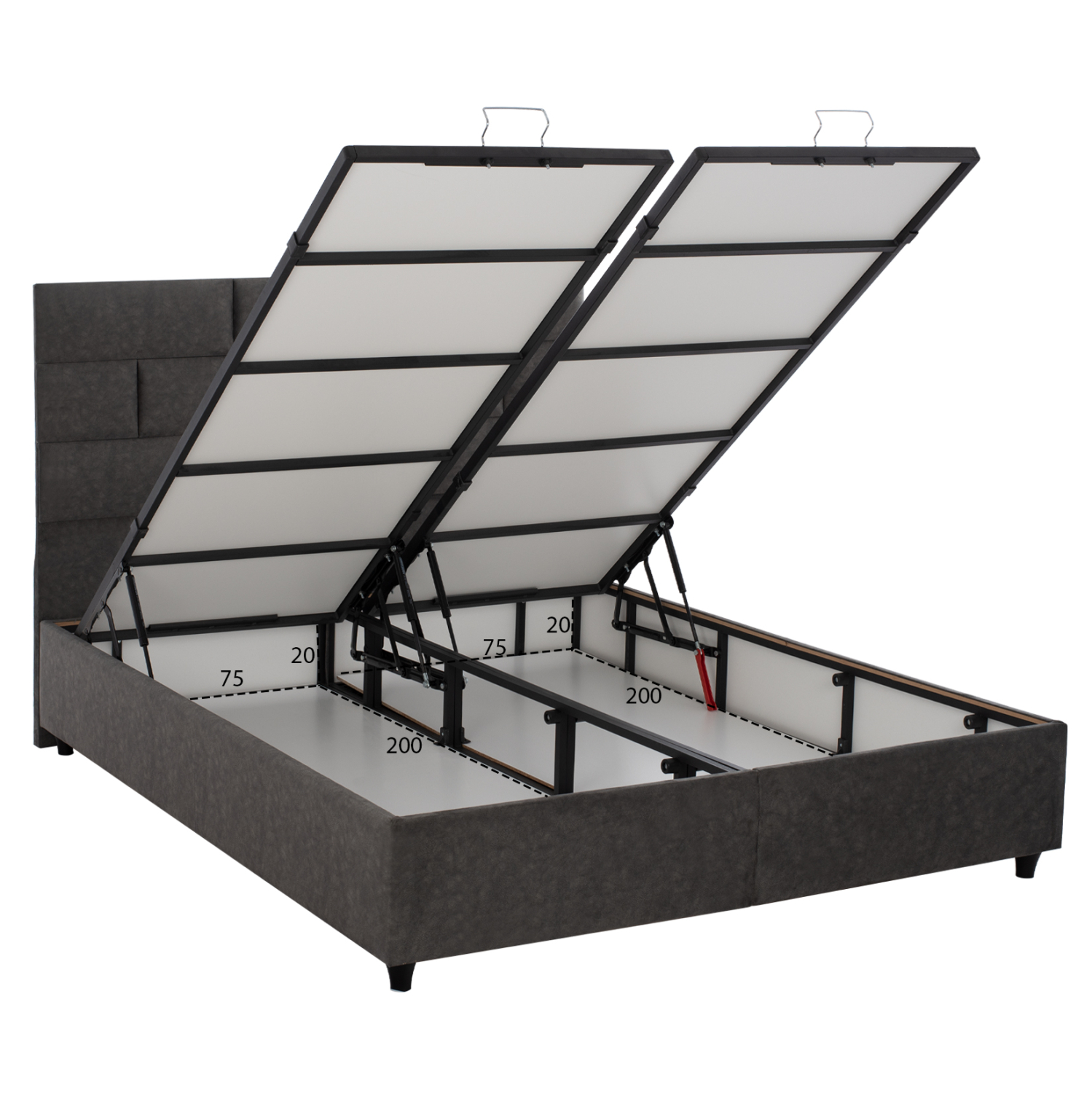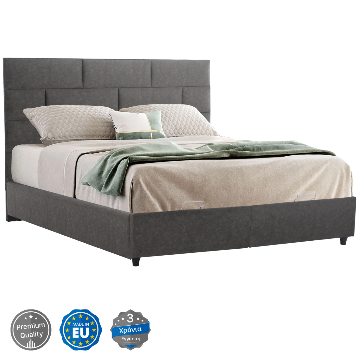 Με το κρεβάτι SOLEDAD με 3-ΕΤΗ ΕΓΓΥΗΣΗ ΣΚΕΛΕΤΟΥ δεν θα ζητήσετε ποτέ κάτι άλλο. Το κεφαλάρι είναι ψηλό και επενδυμένο με τετραγωνισμένη ορθογώνια καπιτονέ τεχνοτροπία, ενώ και όλη η επένδυση του κρεβατιού είναι από εξαιρετικό ανάγλυφο ύφασμα τύπου NUBUCK. Το ΓΚΡΙ χρώμα σε όλο το κρεβάτι είναι εντυπωσιακό και μπορεί να συνδυαστεί με πληθώρα διακοσμητικών μοτίβων. Όμως, το κύριο χαρακτηριστικό αυτού του κρεβατιού είναι ότι δεν ακολουθεί την κλασική κατασκευή με τις τάβλες του σομιέ για την στήριξη του στρώματος, αλλά αντίθετα αποτελείται από μια συνεχόμενη επιφάνεια (2 μοριοσανίδες) πάνω στην οποία τοποθετείται το στρώμα! Επιπλέον, η κάθε επιφάνεια από μοριοσανίδα ανασηκώνεται με μεταλλικό μηχανισμό ασφαλείας με 4 αμορτισέρ και μεταλλικές λαβές προσφέροντας έναν μεγάλο αποθηκευτικό χώρο. Σε διαστάσεις υπέρδιπλου στρώματος 160×200 εκ. θα χωρέσει κάθε σας όνειρο!
