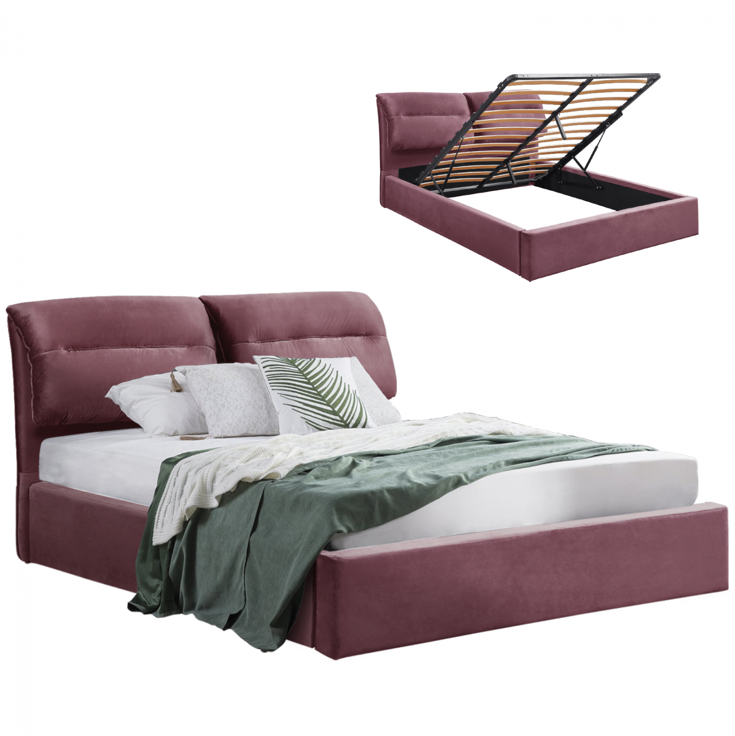 Σε διάσταση για στρώμα 160×200 εκ, είναι επαρκέστατα άνετο για να χωρέσουν δύο άτομα. Έχει κεφαλάρι με δύο μαξιλάρια δεμένα πάνω του (αποσπώμενα με φερμουάρ) για να προσφέρει άνεση όταν κάθεστε για να διαβάσετε το βιβλίο σας, ενώ ολόκληρη η επένδυσή του έχει γίνει με εξαιρετικής ποιότητας βελούδινο ύφασμα σε ΣΑΠΙΟ ΜΗΛΟ χρώμα. Το στρώμα «κάθεται» πάνω σε δύο σειρές από ανατομικές τάβλες, ακολουθώντας τον παραδοσιακό τρόπο κατασκευής κρεβατιού. Επιπλέον, το τελάρο με τις τάβλες στήριξης του στρώματος ανασηκώνεται με μεταλλικό μηχανισμό ασφαλείας με 2 αμορτισέρ προσφέροντας έναν μεγάλο αποθηκευτικό χώρο, ο οποίος φυσικά καταλαμβάνει όλο τον χώρο μέχρι το δάπεδο.