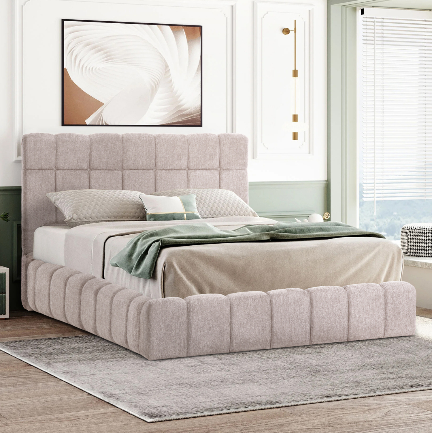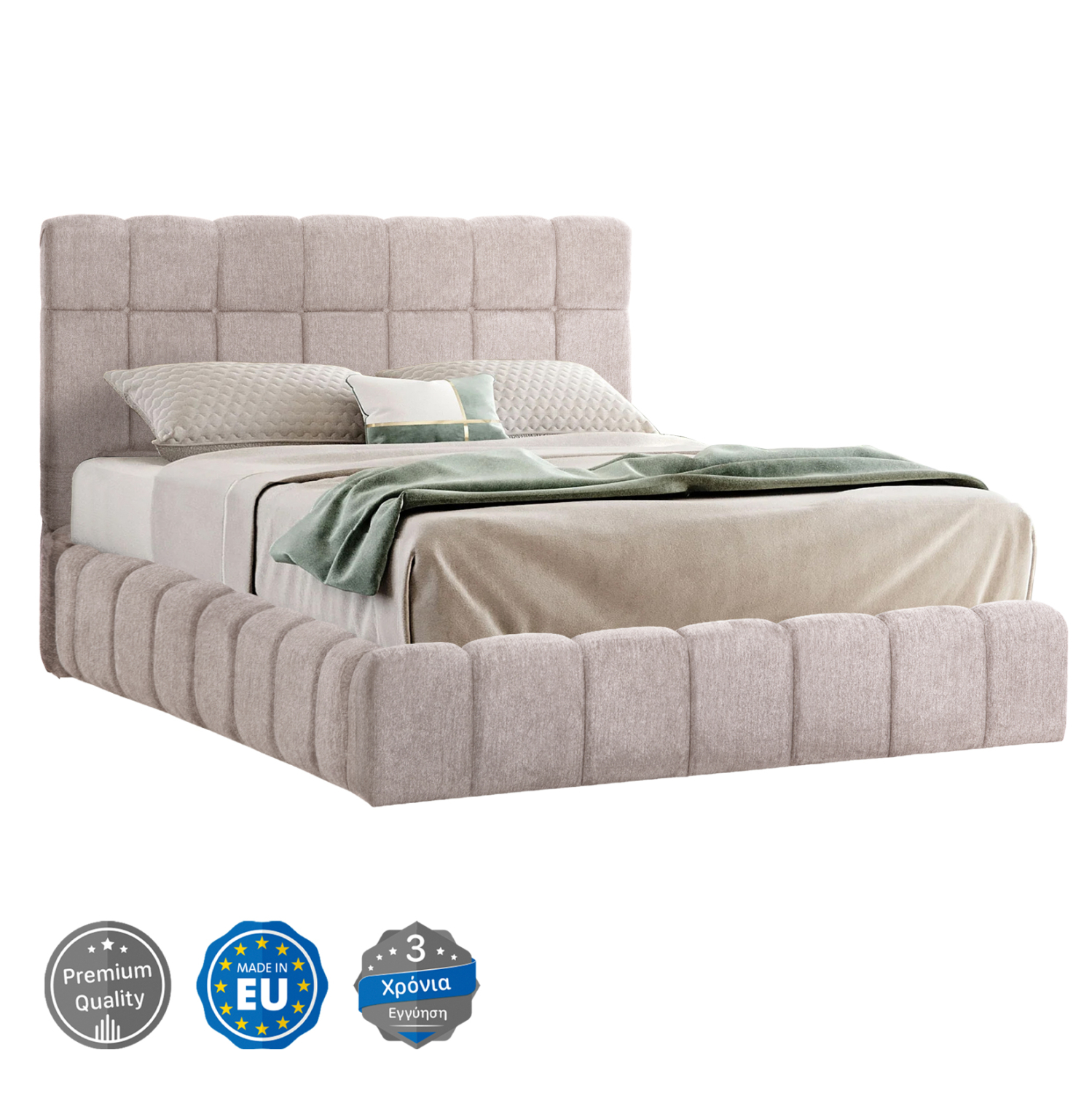 Το RAMON είναι ένα κρεβάτι που θα αγαπήσετε με την πρώτη ματιά! Το κεφαλάρι είναι ψηλό με τεχνοτροπία καπιτονέ από «ζεστό» και εντυπωσιακό ύφασμα TEDDY σε ΜΠΕΖ χρώμα. Τα πλαϊνά του κρεβατιού αλλά και το ποδαρικό είναι ίδιας αισθητικής με το κεφαλάρι και «αγκαλιάζουν» το στρώμα! Όμως, το κύριο χαρακτηριστικό αυτού του κρεβατιού είναι ότι δεν ακολουθεί την κλασική κατασκευή με τις τάβλες του σομιέ για την στήριξη του στρώματος, αλλά αντίθετα αποτελείται από μια συνεχόμενη επιφάνεια (2 μοριοσανίδες), πάνω στις οποίες τοποθετείται το στρώμα! Επιπλέον, η κάθε επιφάνεια από μοριοσανίδα ανασηκώνεται με μεταλλικό μηχανισμό ασφαλείας με 4 αμορτισέρ και διαφανείς πλαστικές λαβές προσφέροντας έναν μεγάλο αποθηκευτικό χώρο. Σε διπλή διάσταση στρώματος 160×200 εκ. θα χωρέσει κάθε σας όνειρο!