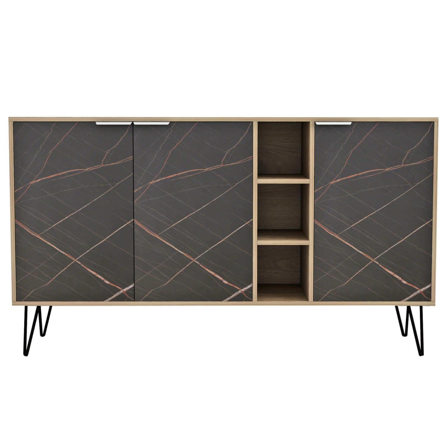 Ο μπουφές CABRON είναι ένα όμορφο έπιπλο όπου κι αν τον τοποθετήσετε. Έχει ψηλά ΜΑΥΡΑ μεταλλικά πόδια ενώ το μήκος του εξασφαλίζει ότι η επιφάνεια του είναι αρκετή για τοποθέτηση πολλών αντικειμένων. Στην αριστερή πλευρά όπως το βλέπει κάποιος, έχει ένα ντουλάπι με δύο πόρτες κι ένα ράφι στο εσωτερικό. Στην μέση σχεδόν του επίπλου και προς τα δεξιά, υπάρχει ελεύθερος χώρος με ραφάκια. Στην δεξιά πλευρά υπάρχει ένα μονό κλειστό ντουλάπι με ένα ράφι στο εσωτερικό του. Το χρώμα όλης της κατασκευής είναι SONAMA, ενώ και οι 3 πόρτες είναι σε χρώμα ΜΑΥΡΟΥ ΜΑΡΜΑΡΟΥ. Τι είναι όμως ο μπουφές;