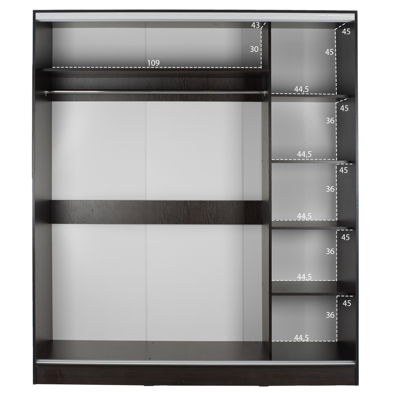 ΗΜ2434.02-Ντουλάπα—Γνωρίστε την δίφυλλη ντουλάπα ADLER. Πρόκειται για μια πρακτικότατη ντουλάπα που έχει φτιαχτεί με γνώμονα την όσο το δυνατόν καλύτερη εκμετάλλευση του χώρου. Οι πόρτες είναι συρόμενες, ενώ η μία από αυτές είναι ολόκληρη εξοπλισμένη με καθρέπτη, για να μην χρειαστείτε ξεχωριστό έπιπλο που θα καταλάμβανε επιπλέον χώρο. Το εσωτερικό της ντουλάπας χωρίζεται σε 2 μέρη. Η μία πλευρά διαθέτει παταράκι και κάτω από το παταράκι μια ράγα για κρεμάστρες. Η άλλη πλευρά έχει ράφια. Η ντουλάπα αυτή έχει χρώμα WENGE και θα ταιριάξει σε κάθε σπίτι.