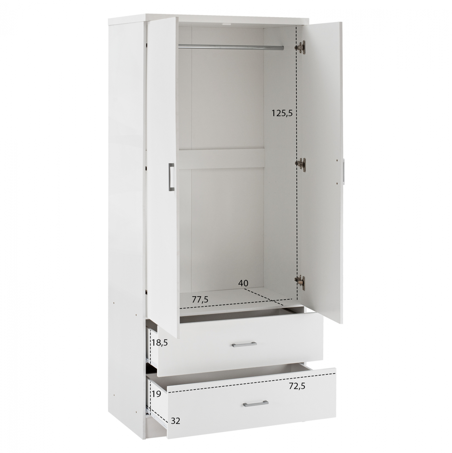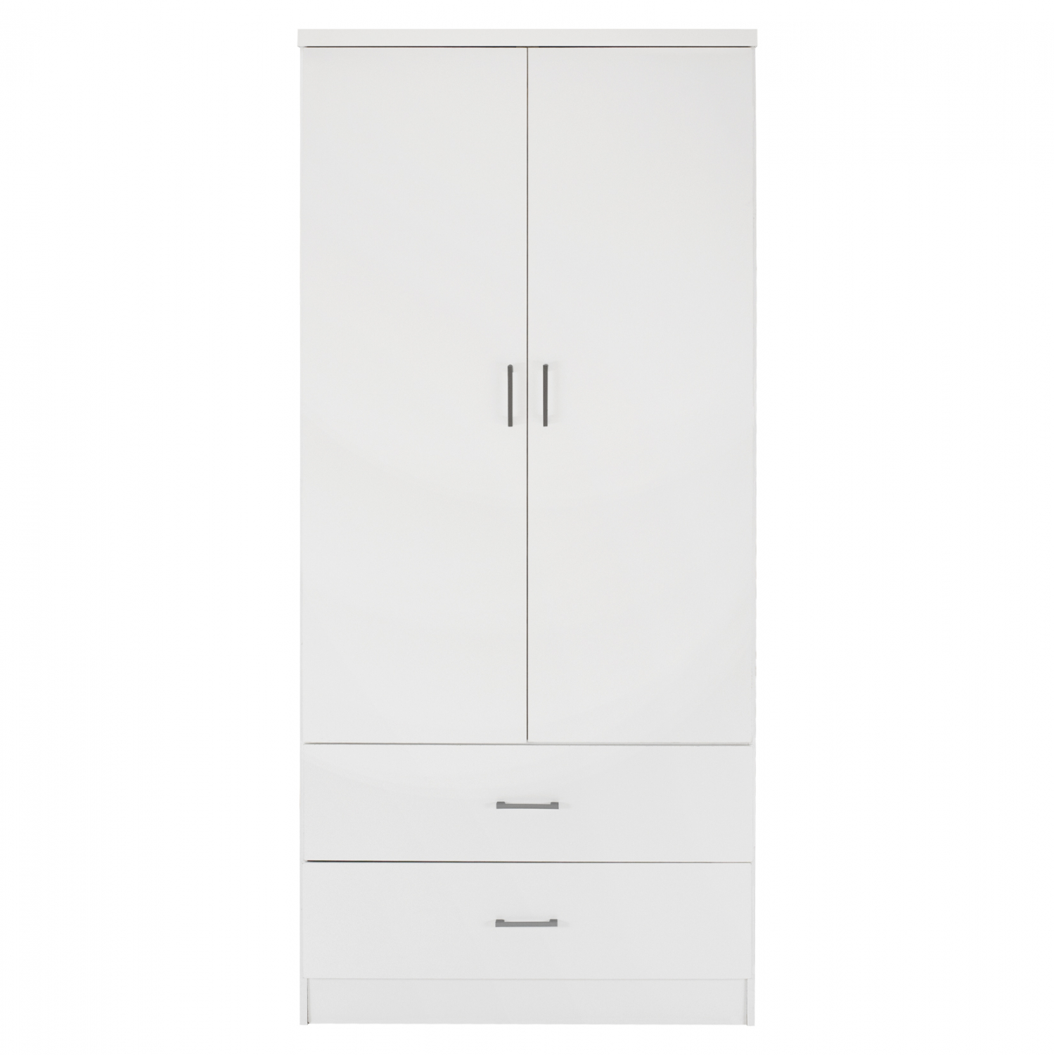 Ντουλάπα μελαμίνης δίφυλλη με δύο συρτάρια σε λευκή απόχρωση.
