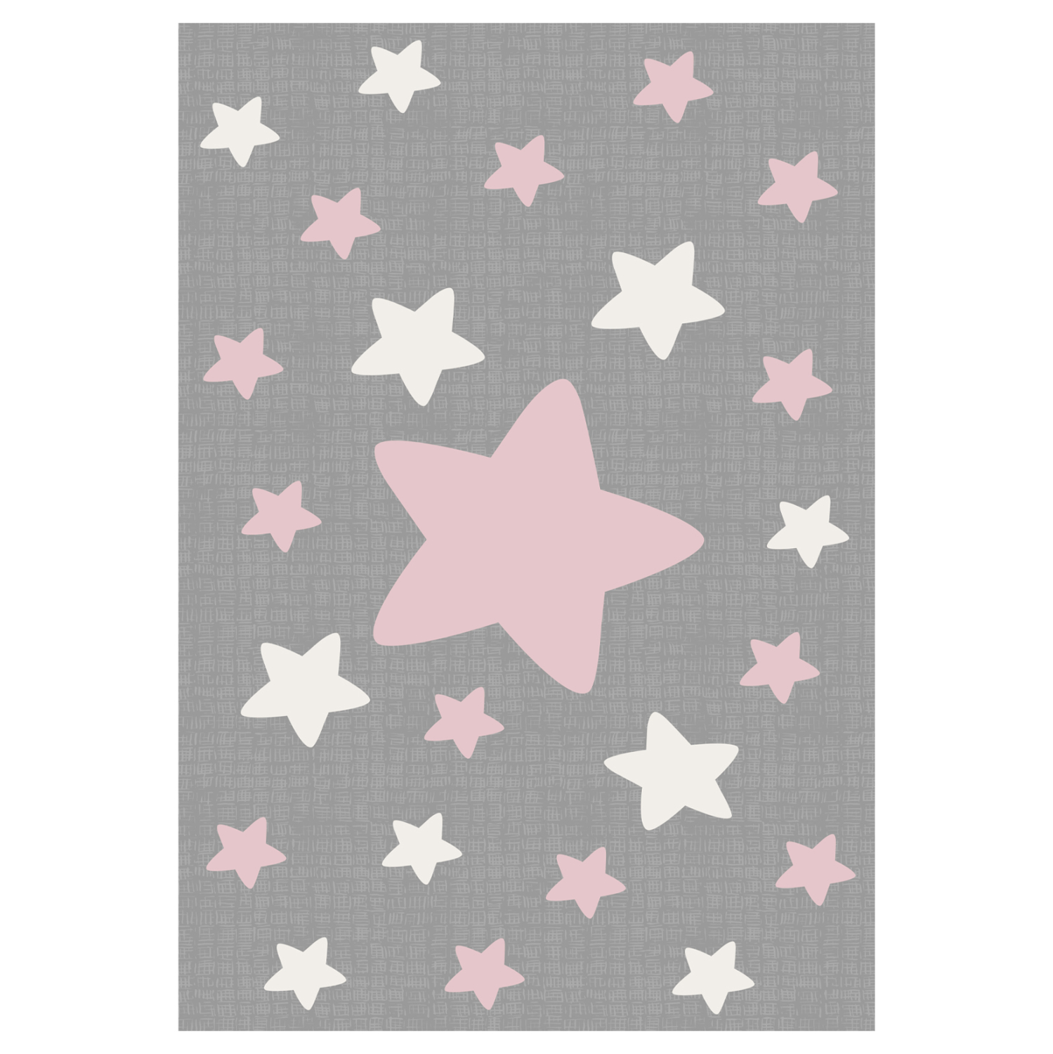 Αυτό το όμορφο χαλί έχει φόντο με κυρίαρχο χρώμα το γκρι σε όλη την επιφάνεια του χαλιού, και δεν διαθέτει μπορντούρα. Το σχέδιο του χαλιού είναι ευχάριστο και απεικονίζει αστέρια άσπρα και ροζ σε διάφορα μεγέθη.