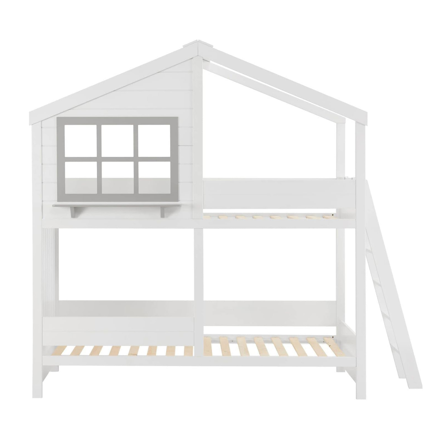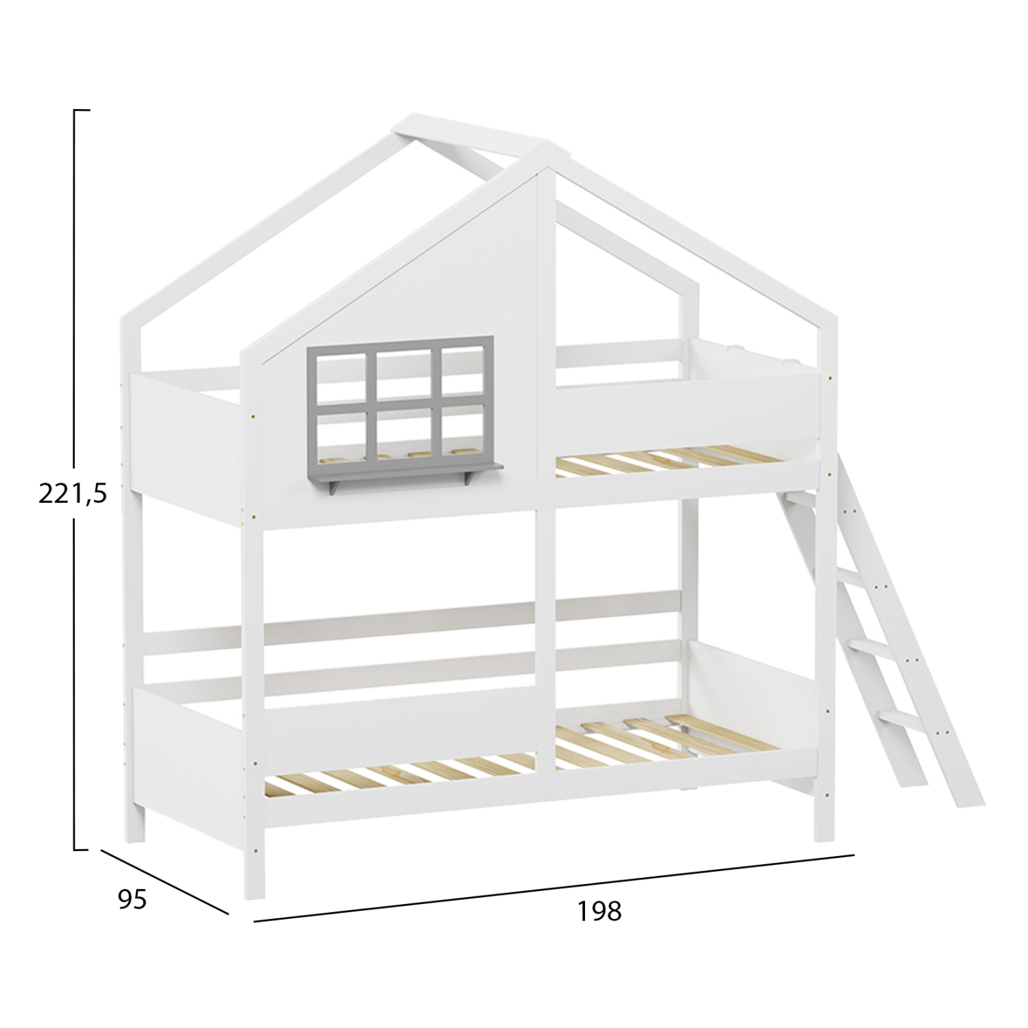 Σας παρουσιάζουμε την καινούργια παιδική κουκέτα-κρεβάτι COMBO τύπου Montessori που σημαίνει ότι έχει σχεδιαστεί σύμφωνα με το εκπαιδευτικό σύστημα Montessori, σύμφωνα με το οποίο τα παιδιά μαθαίνουν καλύτερα, όταν επιλέγουν μόνα τους τι θα κάνουν. Είναι σε διάσταση για μονά στρώματα 90×200 εκ, και αποτελεί μια άριστης ποιότητας, μοντέρνα και ασφαλή επιλογή για το παιδικό δωμάτιο. Είναι ξύλινη σε ΛΕΥΚΟ χρώμα βαμμένη με αβλαβές μη τοξικό βερνίκι με βάση το νερό, ιδανικό για παιδιά. Τα στρώματα τοποθετούνται σε τάβλες κατασκευασμένες από ξυλεία κόντρα πλακέ. Η κουκέτα έχει σχήμα σπιτάκι και μάλιστα το επάνω κρεβάτι έχει κι ένα παραθυράκι με εξωτερικό ράφι που θα εξάψει την φαντασία των παιδιών. Η πρόσβαση στο επάνω κρεβάτι το οποίο διαθέτει και κάγκελα περιμετρικά, γίνεται με μια όμορφη κρεμαστή σκάλα που μπορεί να τοποθετηθεί από όποια πλευρά σας βολεύει. Το κάτω κρεβάτι διαθέτει επίσης κάγκελα, αλλά και σχετικά ψηλά πόδια.
