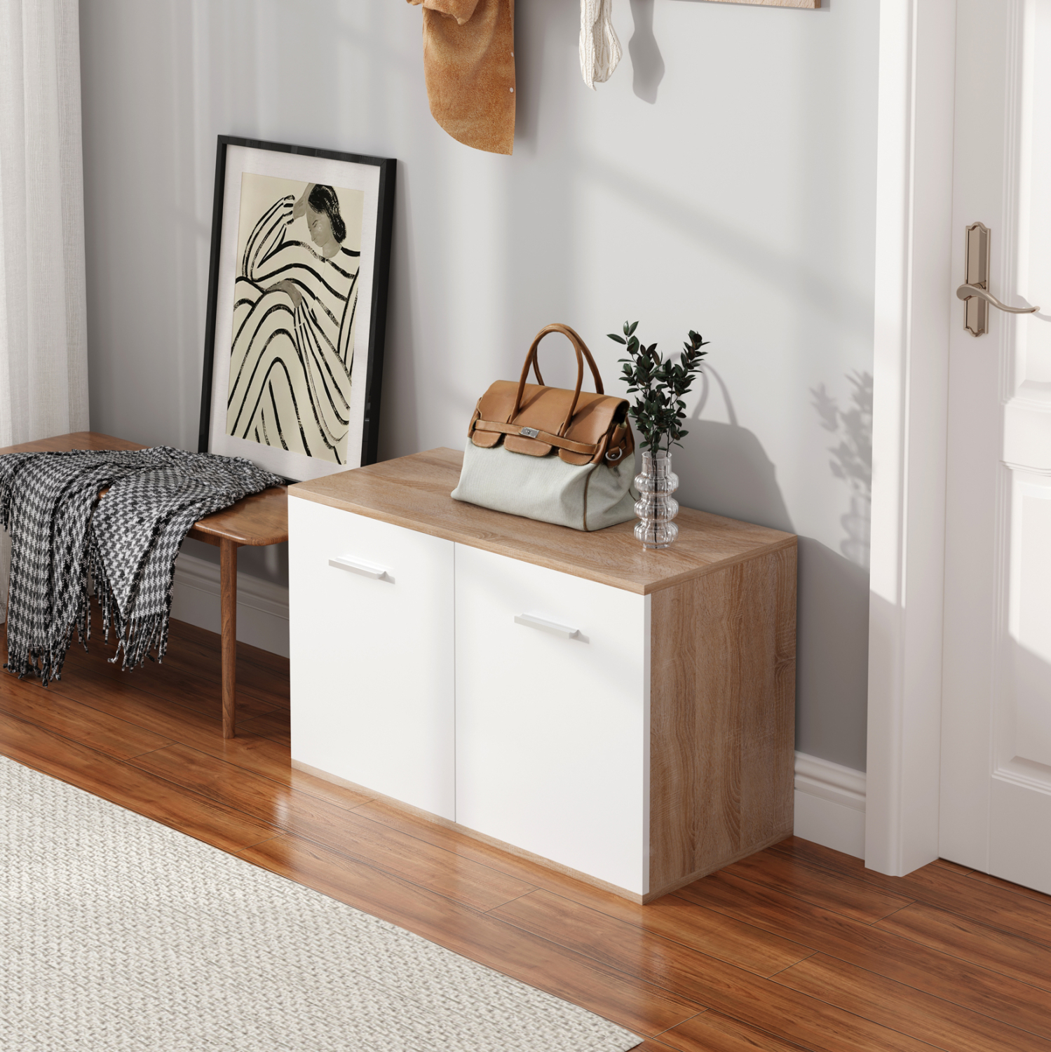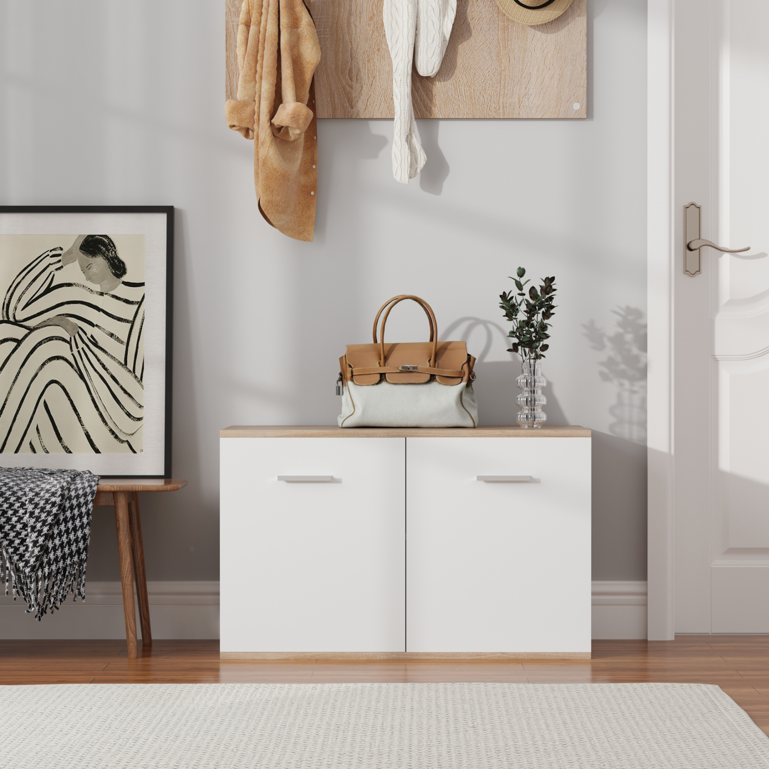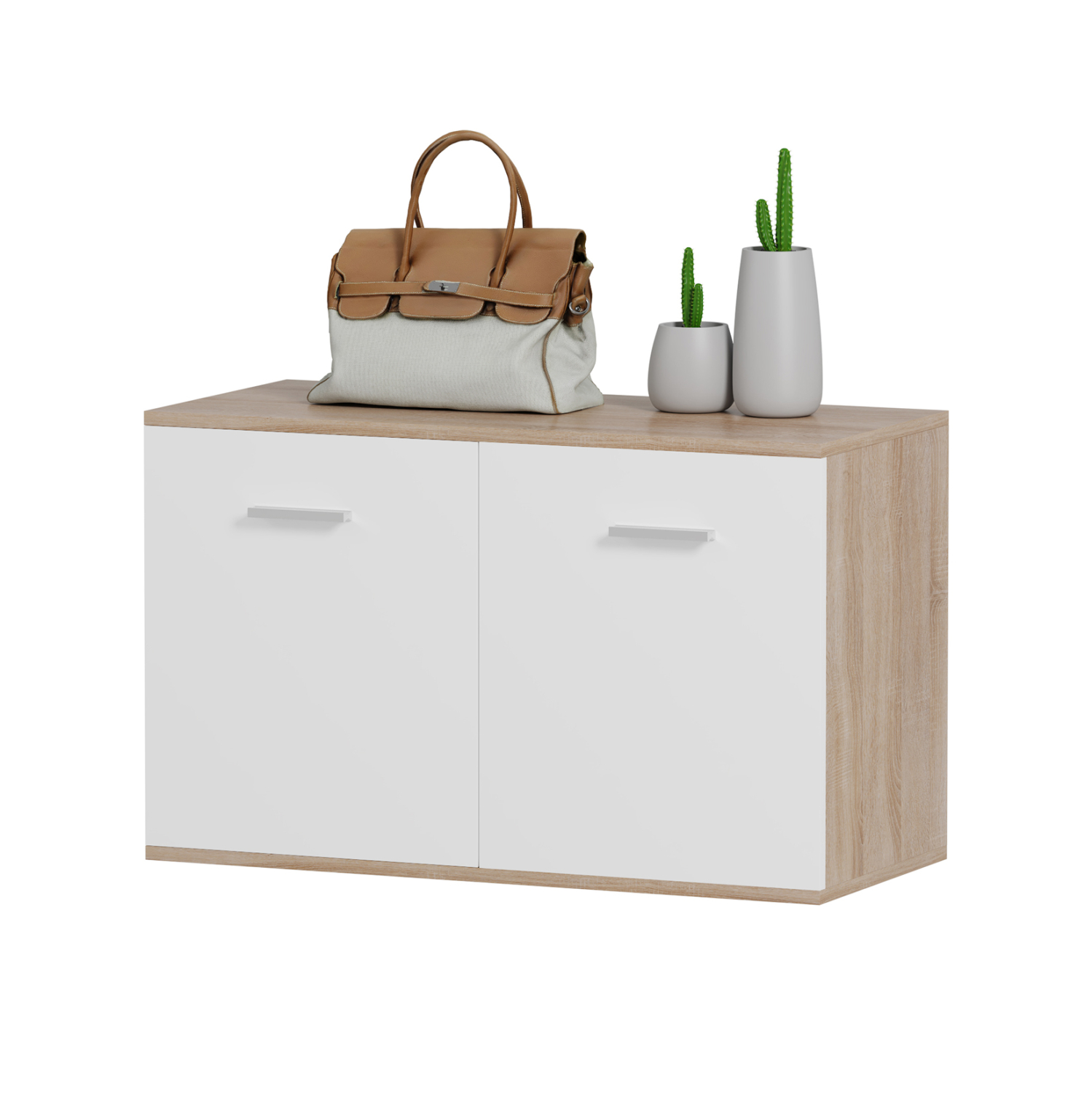 Σας παρουσιάζουμε την παπουτσοθήκη μελαμίνης DIONNE σε SONAMA και ΛΕΥΚΟ χρώμα. Ένα έπιπλο με κλασικό σχεδιασμό ντουλαπιού, που διαθέτει ένα ράφι που δημιουργεί 2 χώρους τοποθέτησης παπουτσιών και κλείνει με δύο πόρτες με όμορφα ασημί χερούλια. Σκοπός μας είναι να σας βοηθήσουμε να οργανώσετε και να βελτιώσετε με τον καλύτερο δυνατό τρόπο την λειτουργικότητα του σπιτιού σας.