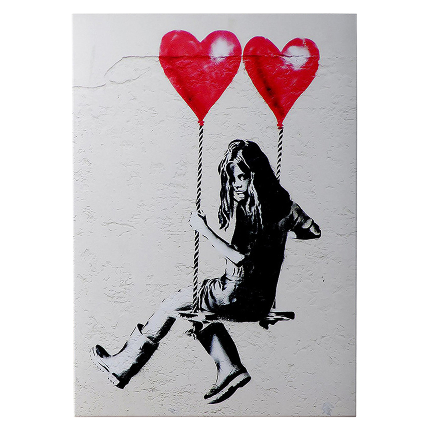 Ένας πίνακας τοίχου μεταμορφώνει τον τρόπο που αντιλαμβανόμαστε έναν χώρο. Διακοσμήστε, λοιπόν, τον χώρο σας με την καινούργια σειρά πινάκων τοίχου GOBI! Αυτός ο ασπρόμαυρος πίνακας που απεικονίζει ένα κορίτσι σε μια κούνια που κρέμεται από κόκκινα μπαλόνια-καρδιές έχει υλοποιηθεί σε ψηφιακά εκτυπωμένο καμβά (50% βαμβάκι-50% πολυεστέρας) σε πλαίσιο από ξύλο.