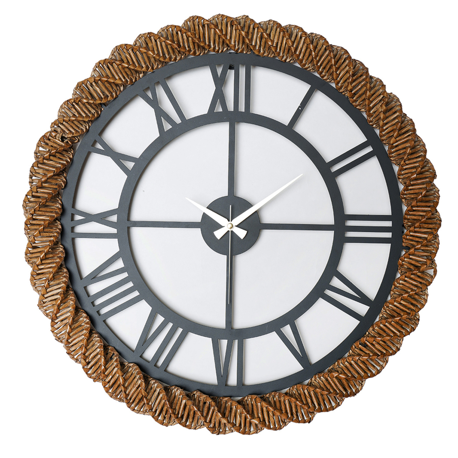 Μια όμορφη και απαραίτητη αισθητική αλλά και χρηστική προσθήκη για κάθε δωμάτιο του σπιτιού ή της επιχείρησής σας. Ένα μεγάλο στρογγυλό ρολόι τοίχου είναι μια κλασική διακοσμητική ιδέα που ποτέ δεν θα παλιώσει. Το HM4337 είναι μεταλλικό με λατινικούς αριθμούς σε ΣΚΟΥΡΟ ΓΚΡΙ χρώμα με χειροποίητη πλεκτή ψάθα περιμετρικά σε ΦΥΣΙΚΟ χρώμα και αποτελεί μια σικάτη και ελκυστική πρόταση για οποιονδήποτε χώρο, που θα εντυπωσιάσει, προσφέροντας ένα όμορφο εστιακό σημείο.