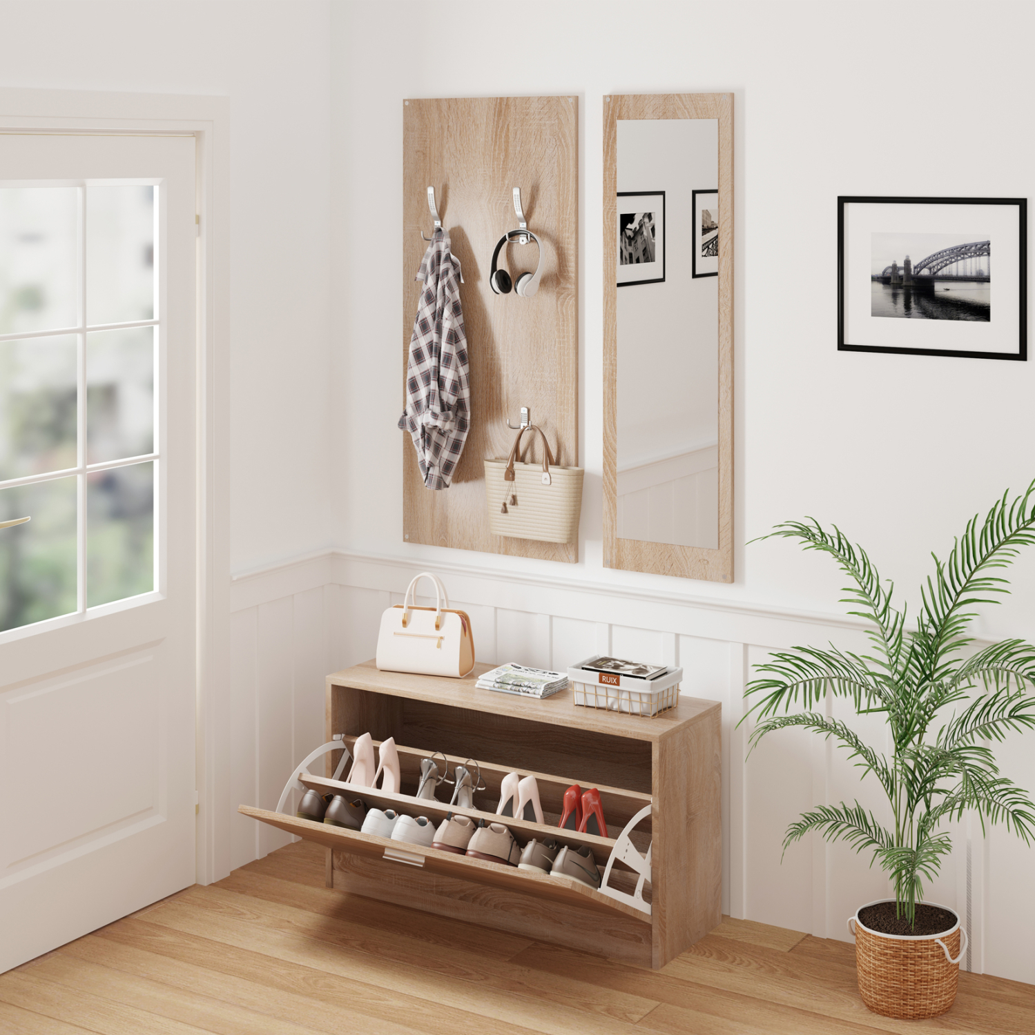 Το έπιπλο εισόδου VERN αποτελείται από 3 κομμάτια. Μία κλασική παπουτσοθήκη, μία κατασκευή με κρεμάστρες ως βεστιάριο αναρτημένη στον τοίχο και ένας καθρέπτης δίπλα από τις κρεμάστρες. Ένα σετ μελαμίνης σε εντυπωσιακό χρώμα SONAMA που θα σας ενθουσιάσει με την πρακτικότητα του, μιας και το κάθε κομμάτι είναι ανεξάρτητο και μπορεί να τοποθετηθεί οπουδήποτε σας βολεύει καλύτερα.
