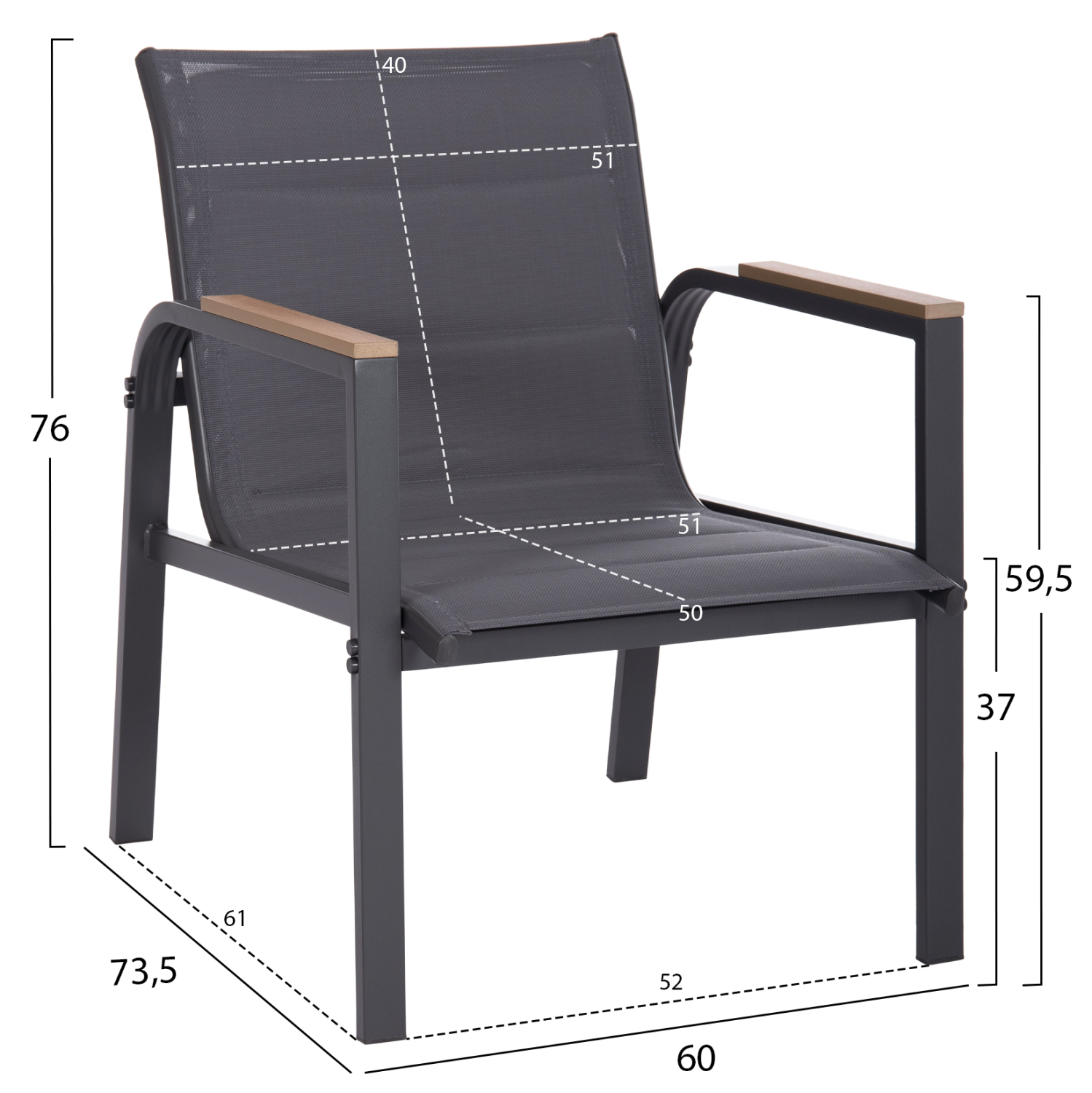 Το σετ σαλόνι εξωτερικού χώρου JULIETTE αποτελείται από έναν 2-θέσιο καναπέ, 2 αναπαυτικές πολυθρόνες, και ένα στρογγυλό τραπεζάκι. Ο καναπές και οι πολυθρόνες διαθέτουν σκελετό αλουμινίου, ενώ το κάθισμα και οι πλάτη τους είναι από ποιοτικό ύφασμα textilene με μια λεπτή γέμιση με αφρώδες υλικό. Το τραπεζάκι πέρα από τον σκελετό αλουμινίου, διαθέτει επιφάνεια από ανθεκτικό γυαλί ασφαλείας (tempered glass). Όλο το σετ είναι σε ΓΚΡΙ χρώμα, ενώ η λεπτομέρεια με το polywood στα μπράτσα προσδίδει στο σετ μια αίσθηση πολυτέλειας.
