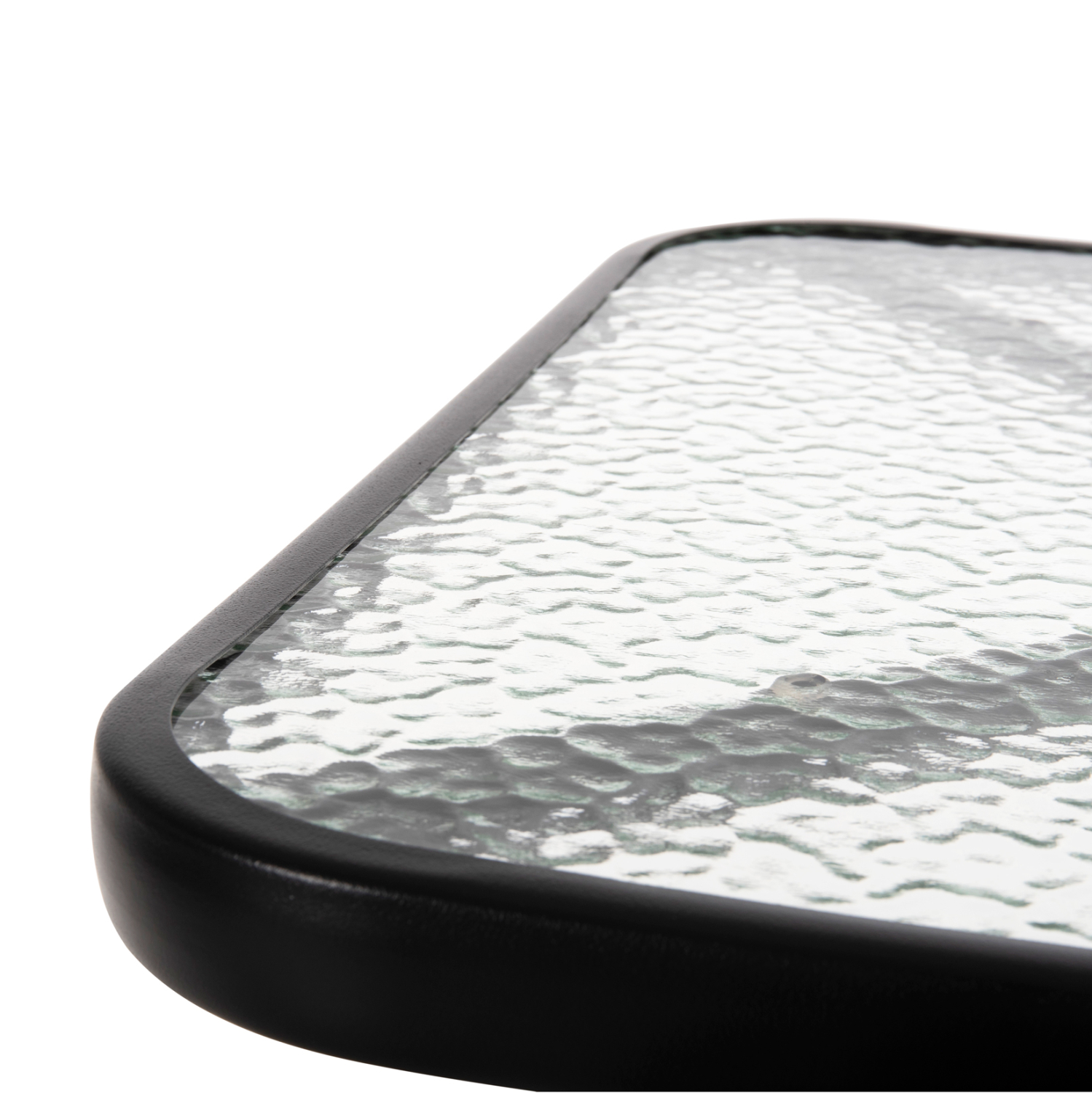 Αυτό το μικρό Σετ τραπεζαρίας εξωτερικού χώρου διαθέτει τετράγωνο τραπέζι με ΜΑΥΡΟ μεταλλικό σκελετό και γυάλινη (safety glass) θολή επιφάνεια, και 2 μεταλλικές πολυθρόνες με κάθισμα& πλάτη από textilene ύφασμα σε ΜΑΥΡΟ, με ξύλινη επένδυση στα μπράτσα.
