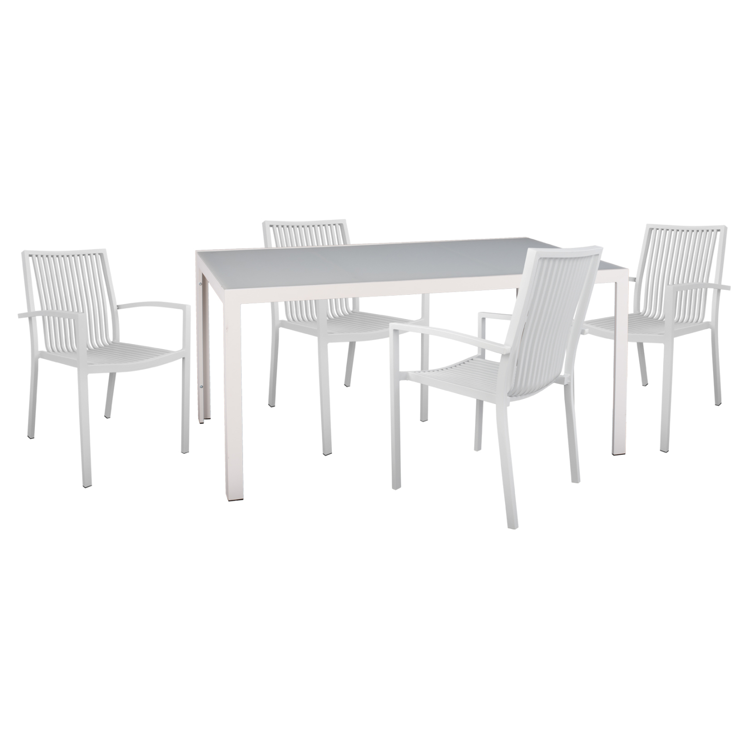Σετ εξωτερικού χώρου BRONCA με τραπέζι με ΛΕΥΚΟ μεταλλικό σκελετό και γυάλινη ΕΝΙΣΧΥΜΕΝΗ επιφάνεια και 4 πολυθρόνες αλουμινίου σε ΛΕΥΚΟ χρώμα. Οι πολυθρόνες είναι ΣΤΟΙΒΑΖΟΜΕΝΕΣ άρα και ιδιαιτέρως πρακτικές, αφού αποθηκεύονται εύκολα και στον μικρότερο δυνατό χώρο.