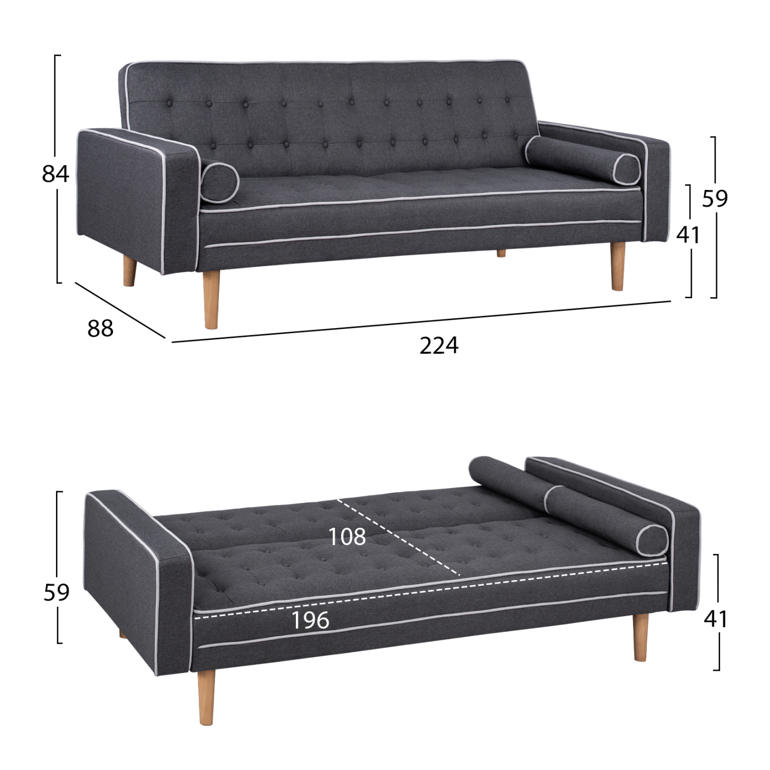3θέσιος καναπές με μπράτσα και με γκρι ύφασμα που γίνεται κρεβάτι όταν «πέφτει» η πλάτη.