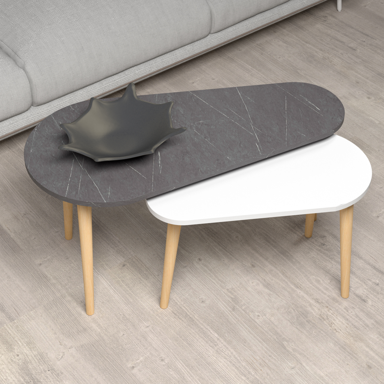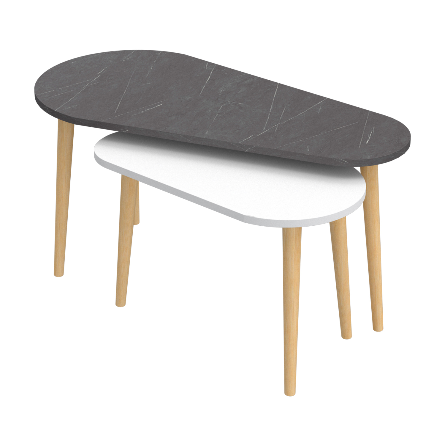 Το καινούργιο σετ 2τμχ οβάλ τραπεζιών για το σαλόνι APRILIA θα ικανοποιήσει και θα εξυπηρετήσει κάθε σας ανάγκη στο χώρο του σαλονιού. Πρόκειται για 2 τρίποδα τραπέζια με επιφάνεια από μελαμίνη 18mm σε χρωματισμό(όψη) ΜΑΥΡΟΥ ΜΑΡΜΑΡΟΥ το ένα και ΛΕΥΚΟ το μικρότερο, ενώ τα πόδια είναι ξύλινα σε ΦΥΣΙΚΟ χρώμα ξύλου.