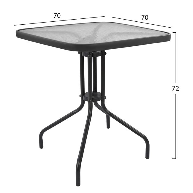 Ένα τραπέζι κατασκευασμένο από μεταλλικό σκελετό σε γκρι απόχρωση με γυάλινη επιφάνεια.