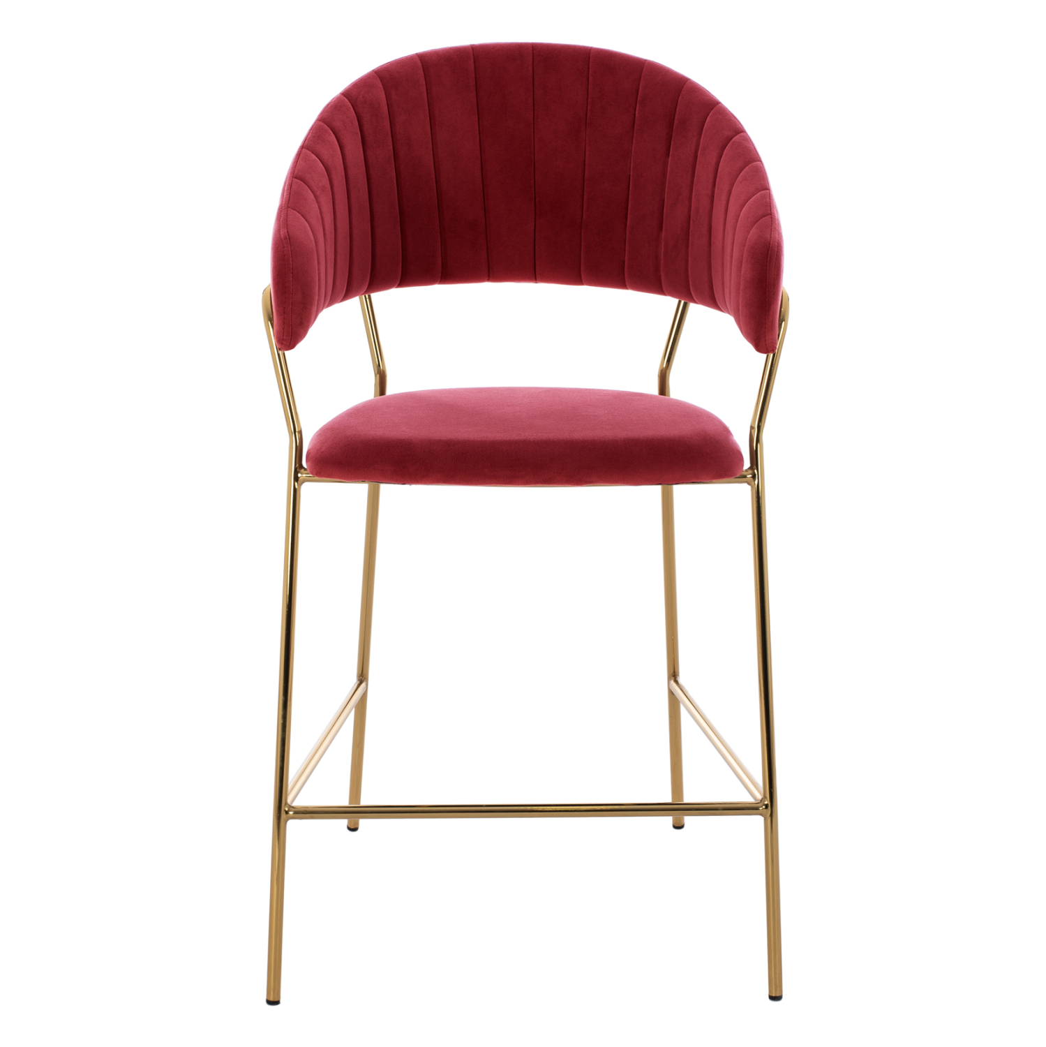 Γνωρίστε το THEODORE. Ένα σκαμπό με ΚΟΚΚΙΝΟ (βουργουνδίας) βελούδινο ύφασμα για μπαρ, που έχει όλα όσα θα θέλατε από ένα τέτοιο έπιπλο. Το THEODORE είναι λιτό, πραγματικά ποιοτικό και κομψό στην όψη, και σίγουρα τραβάει τα βλέμματα. Είναι μεσαίου ύψους με ημικυκλική πλάτη και ο χρυσός μεταλλικός σκελετός καταλήγει σε 4 πόδια τα οποία, όμως, ενώνονται με μια μεταλλική βέργα εμπρός και στα πλαϊνά. Αυτή η βέργα χρησιμεύει ως «σκαλοπάτι» για να ακουμπάτε τα πόδια δίνοντας μεγαλύτερη άνεση στο σκαμπό. Το κάθισμα είναι αναπαυτικό και το σίγουρο είναι ότι αυτό το σκαμπό θα αποτελέσει το κέντρο του ενδιαφέροντος όπου κι αν τοποθετηθεί.
