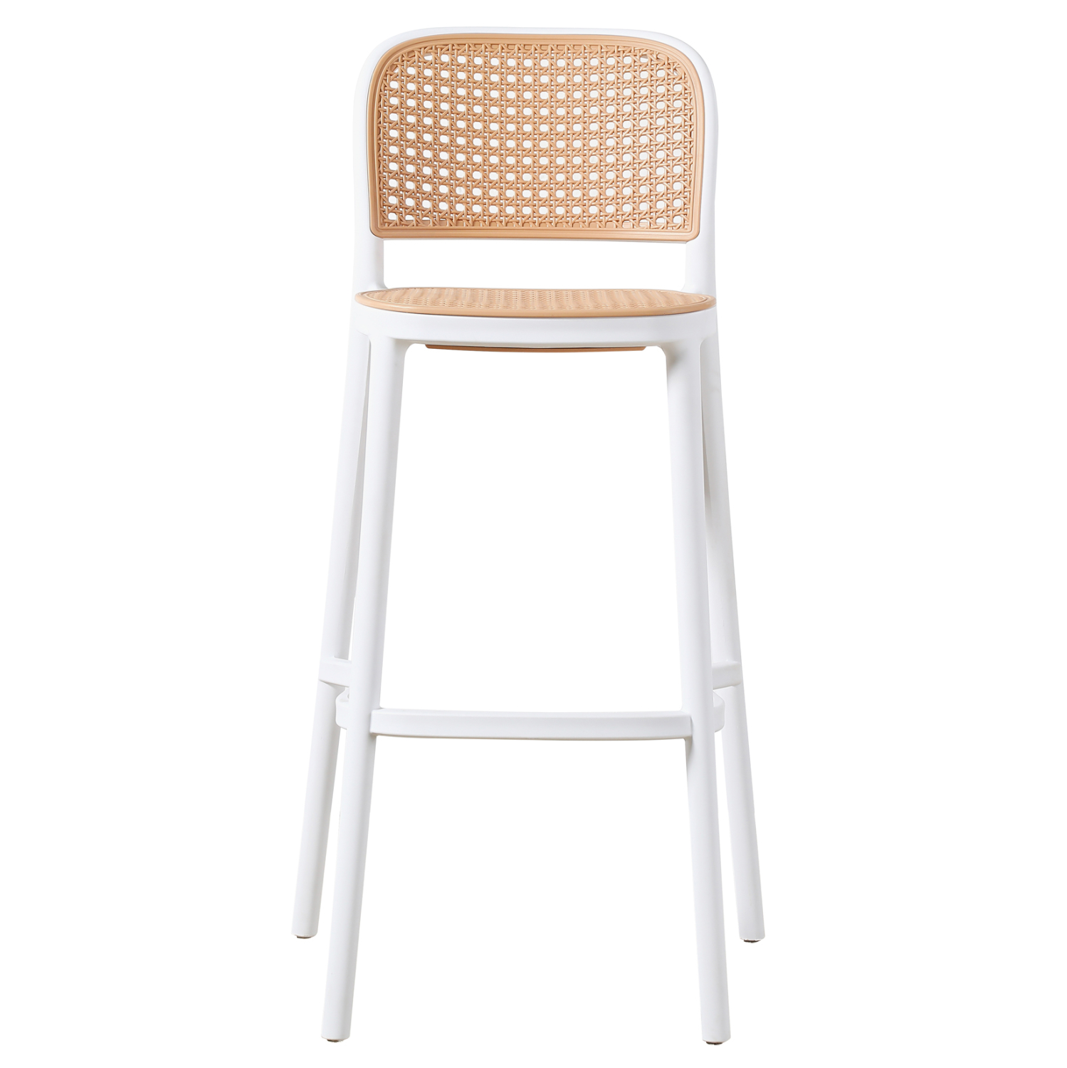 Όλο το σκαμπό είναι από μονοκόμματο πολυπροπυλένιο σε ΛΕΥΚΟ χρώμα με σχετικά χαμηλή πλάτη η οποία είναι σε στυλ “ψάθας” πολυπροπυλενίου, όπως και το κάθισμα, σε ΜΠΕΖ απόχρωση.