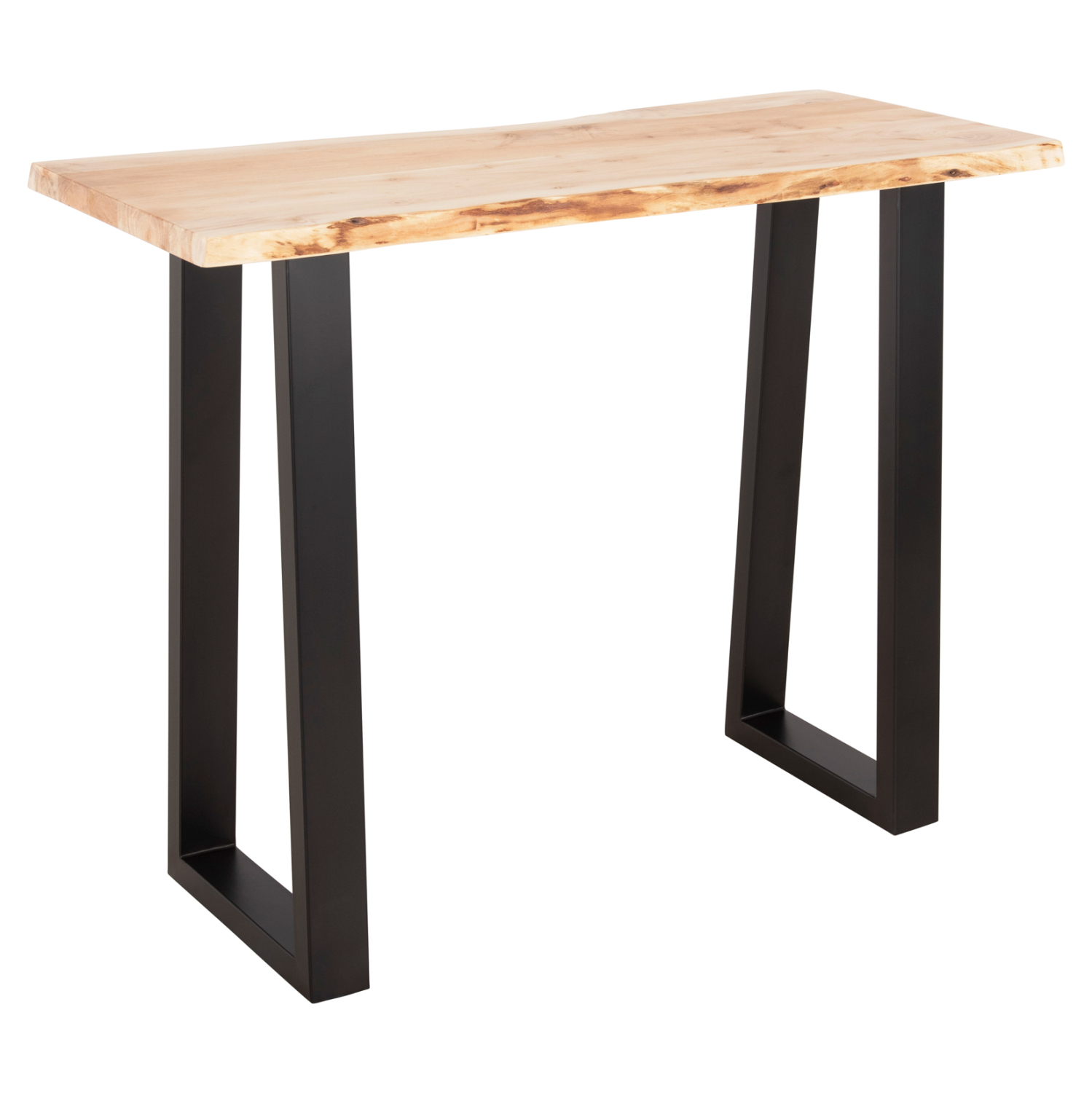 Ανακαλύψτε το μοναδικό χειροποίητο τραπέζι σταντ ΜΟΝΤΑΝΑ με φυσική μασίφ ξύλινη επιφάνεια ακακίας σε ανοιχτόχρωμο ΦΥΣΙΚΟ χρώμα. Στηρίζεται σε δύο τραπεζοειδείς μεταλλικές βάσεις/πόδια σε ΜΑΥΡΟ χρώμα.