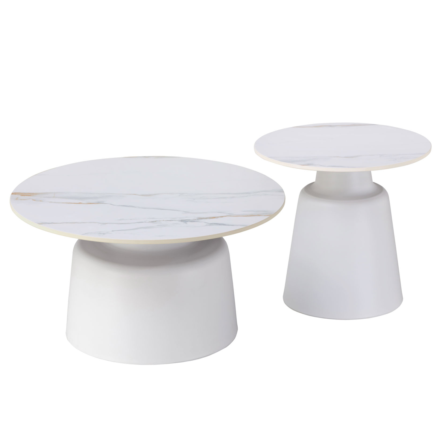 Το σετ 2 τραπεζιών RINKON για το σαλόνι είναι ακόμα μία νέα προσθήκη στην γκάμα μας. Πρόκειται για 2 μεταλλικά τραπεζάκια στρογγυλά διαφορετικών μεγεθών. Το ένα έχει κωνική βάση που καταλήγει σε όμορφο «λαιμό», και το άλλο έχει κυλινδρική σχεδόν βάση. Και τα δύο είναι σε ΛΕΥΚΟ χρώμα. Οι επιφάνειες είναι λείες κεραμικές με όψη ΛΕΥΚΟΥ μαρμάρου με ΧΡΥΣΑ «νερά». Ιδανικά τόσο για το σπίτι, όσο και για επαγγελματικούς χώρους.