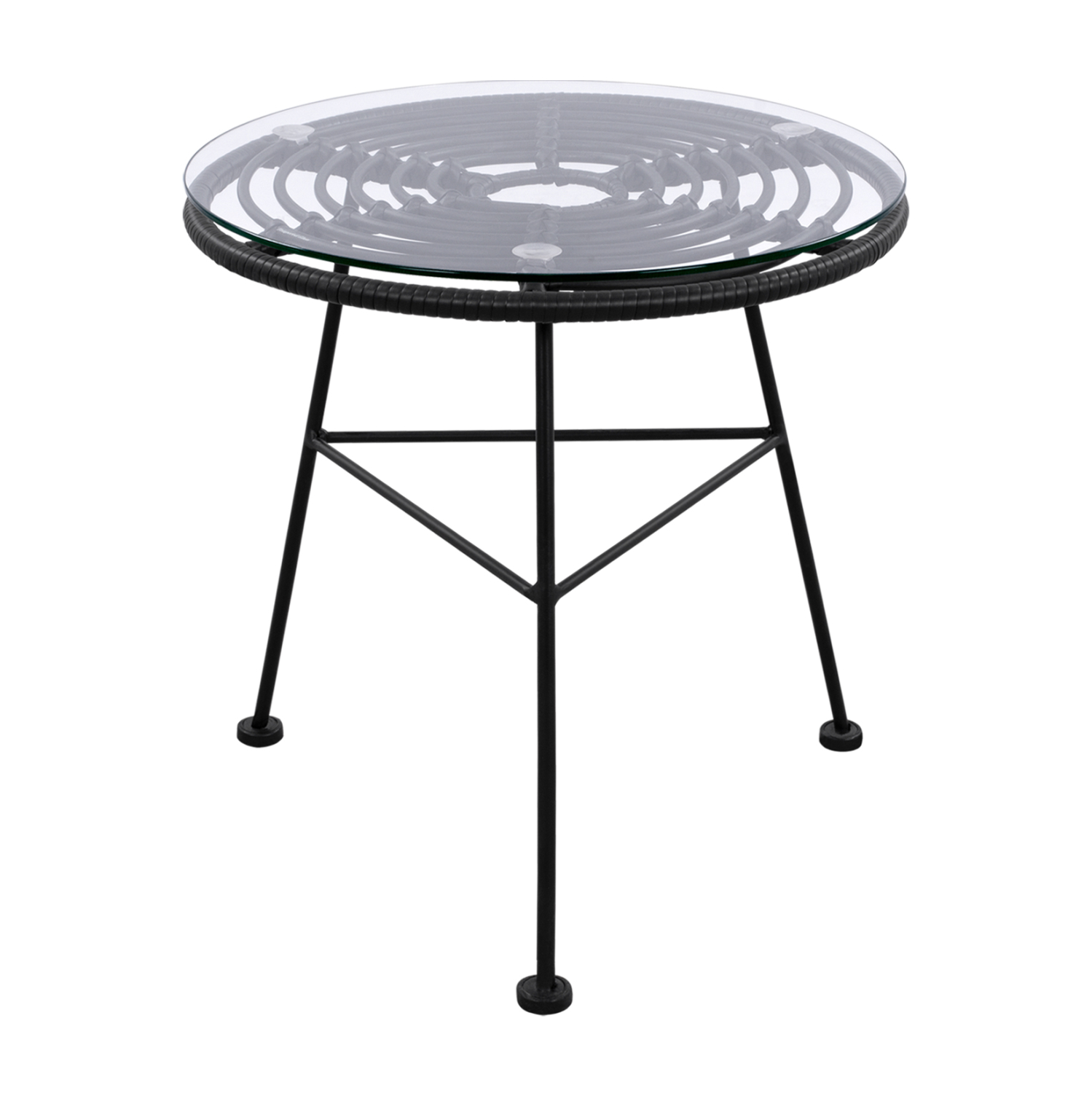 Μοντέρνο τραπέζι εξωτερικού, αλλά και εσωτερικού χώρου, κατασκευασμένο από μεταλλικό σκελετό σε μαύρη απόχρωση και επιφάνεια επενδυμένη με πλεκτό wicker σε μαύρη απόχρωση. Επίσης διαθέτει γυάλινη επιφάνεια.