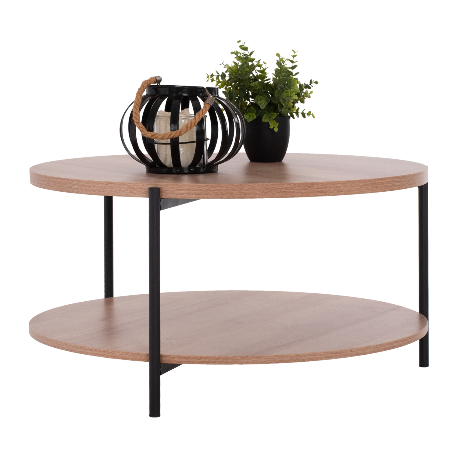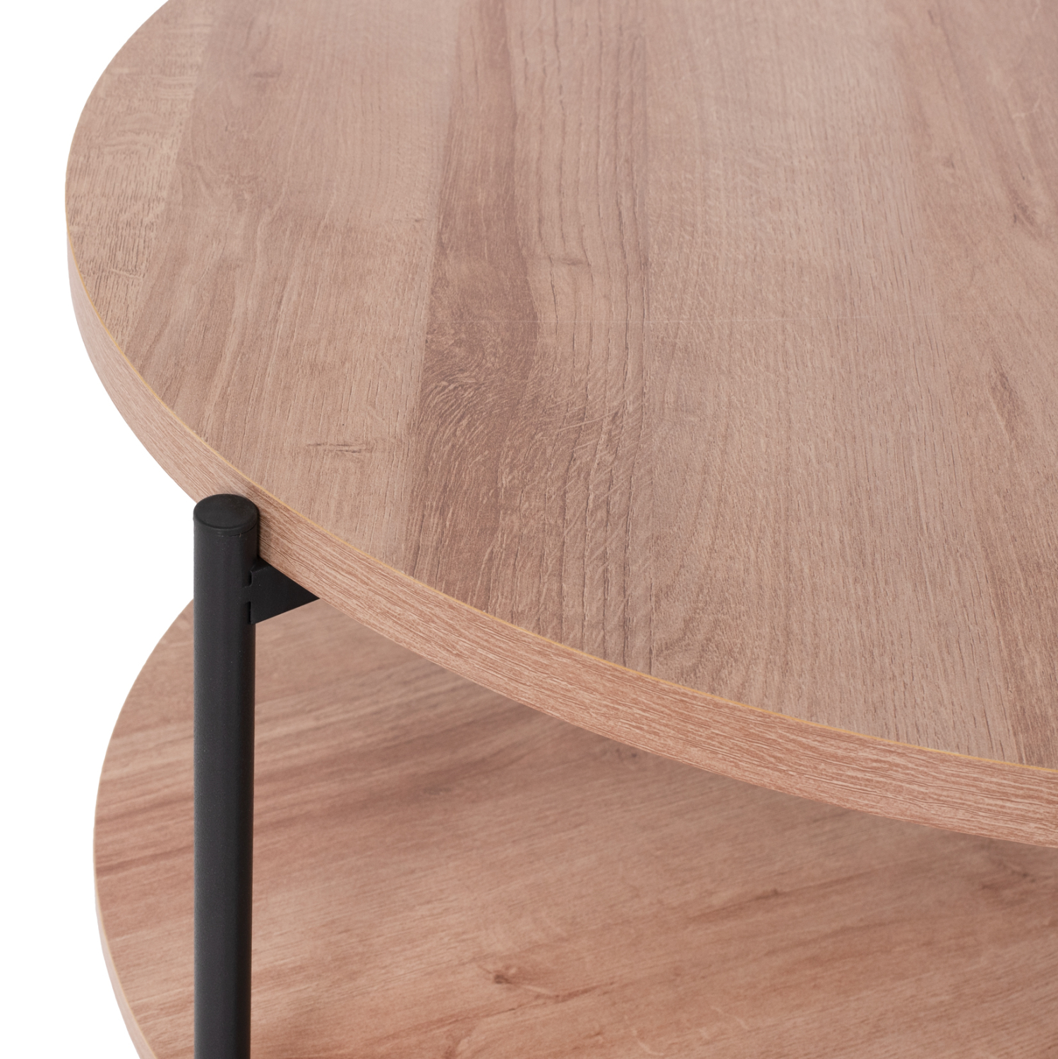 Το MATTEO είναι ένα όμορφο χαμηλό στρογγυλό τραπεζάκι μελαμίνης για το σαλόνι, σε ΟΑΚ χρώμα ξύλου. Το χαρακτηριστικό του είναι ότι διαθέτει 2 επιφάνειες οι οποίες στηρίζονται σε ΜΑΥΡΕΣ μεταλλικές χιαστί βάσεις που είναι ενωμένες με τα πόδια. Αυτό το τραπεζάκι θα αναβαθμίσει αισθητικά το σαλόνι σας ενώ μπορεί να ταιριάξει με πολλά διαφορετικά στυλ και χρώματα στον τριγύρω χώρο.