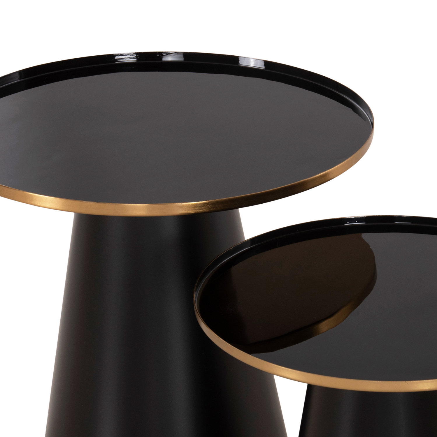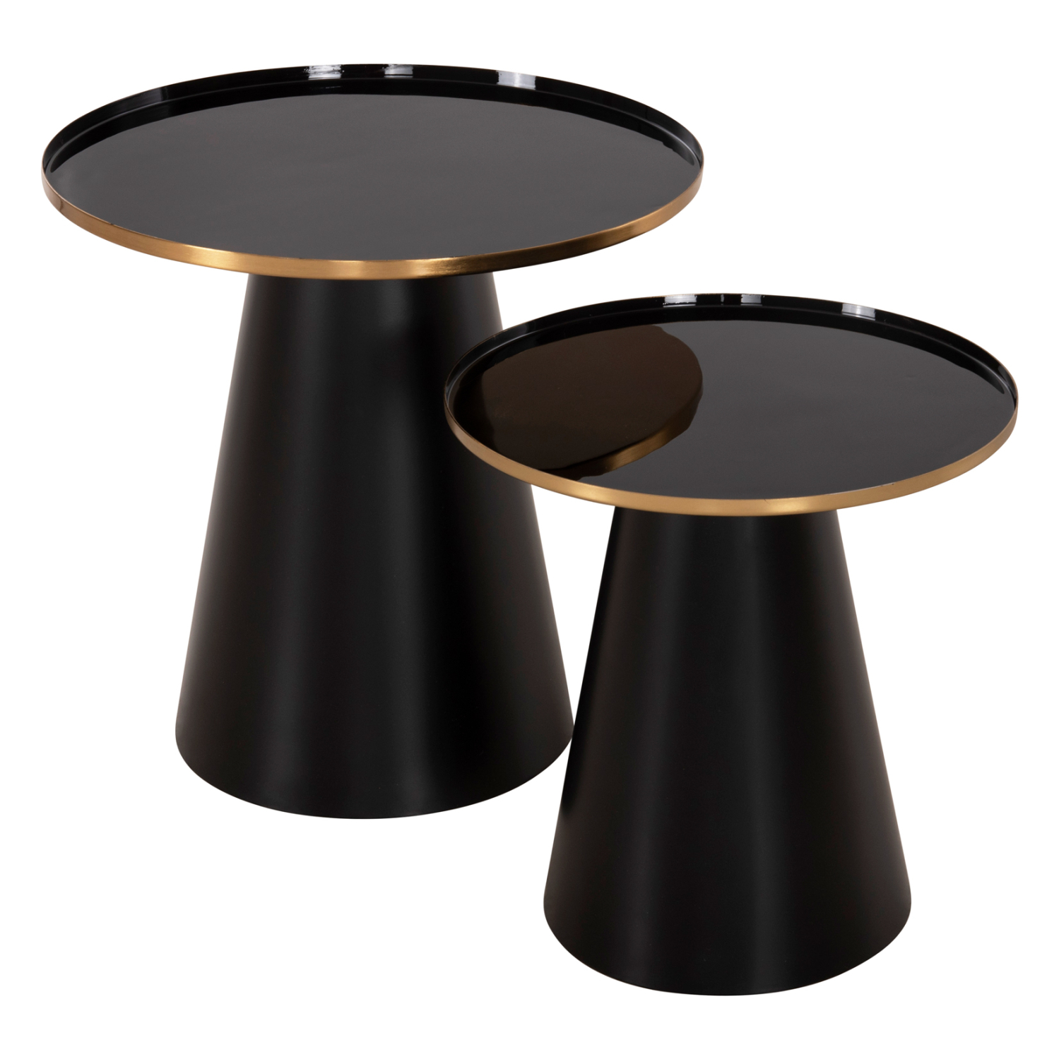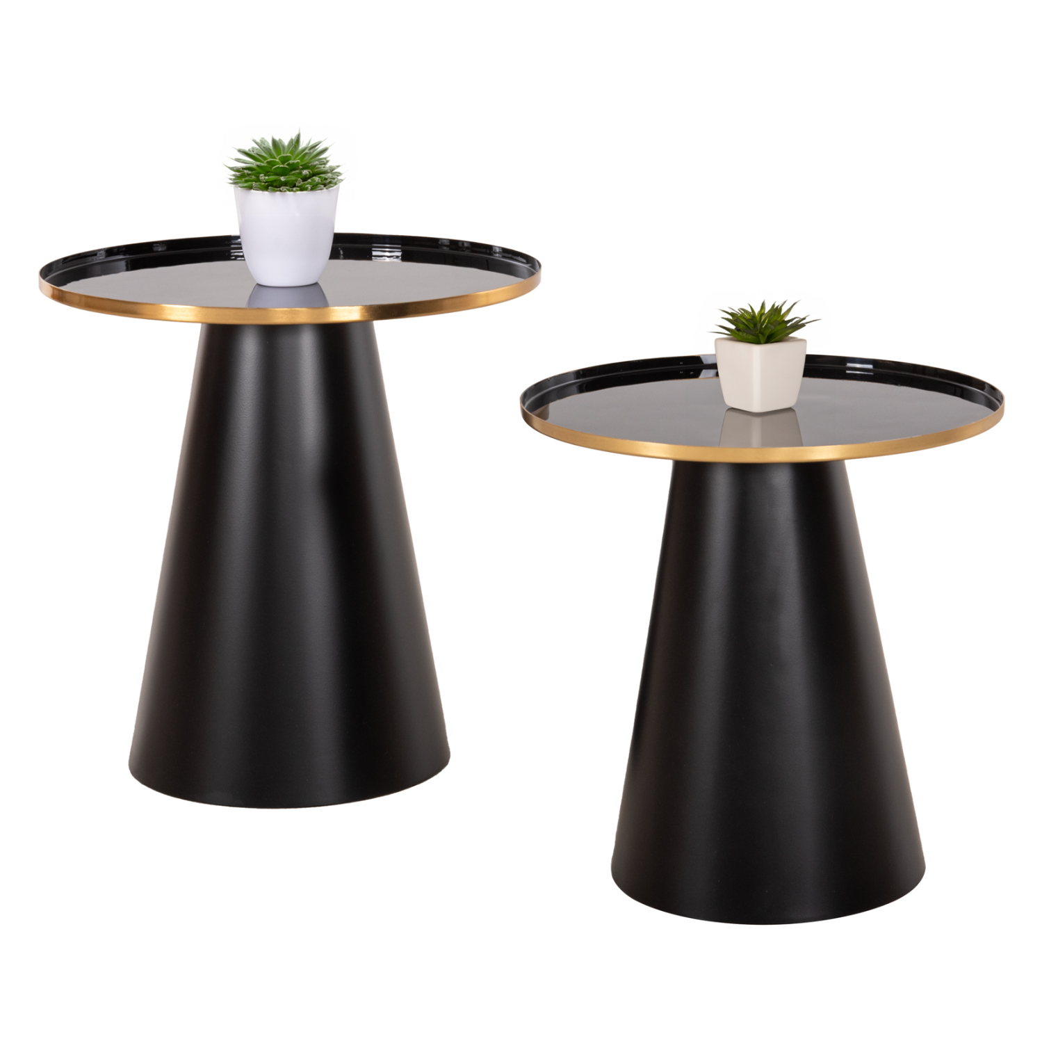 Το σετ 2 τραπεζιών BENG για το σαλόνι είναι μια από τις νέες προσθήκες στην γκάμα μας. Πρόκειται για 2 μεταλλικά τραπεζάκια στρογγυλά με κωνική βάση σε ΜΑΥΡΟ ματ χρώμα. Οι επιφάνειες είναι ΜΑΥΡΕΣ και έχουν χρυσή περίμετρο. Ιδανικά τόσο για το σπίτι, όσο και για επαγγελματικούς χώρους.