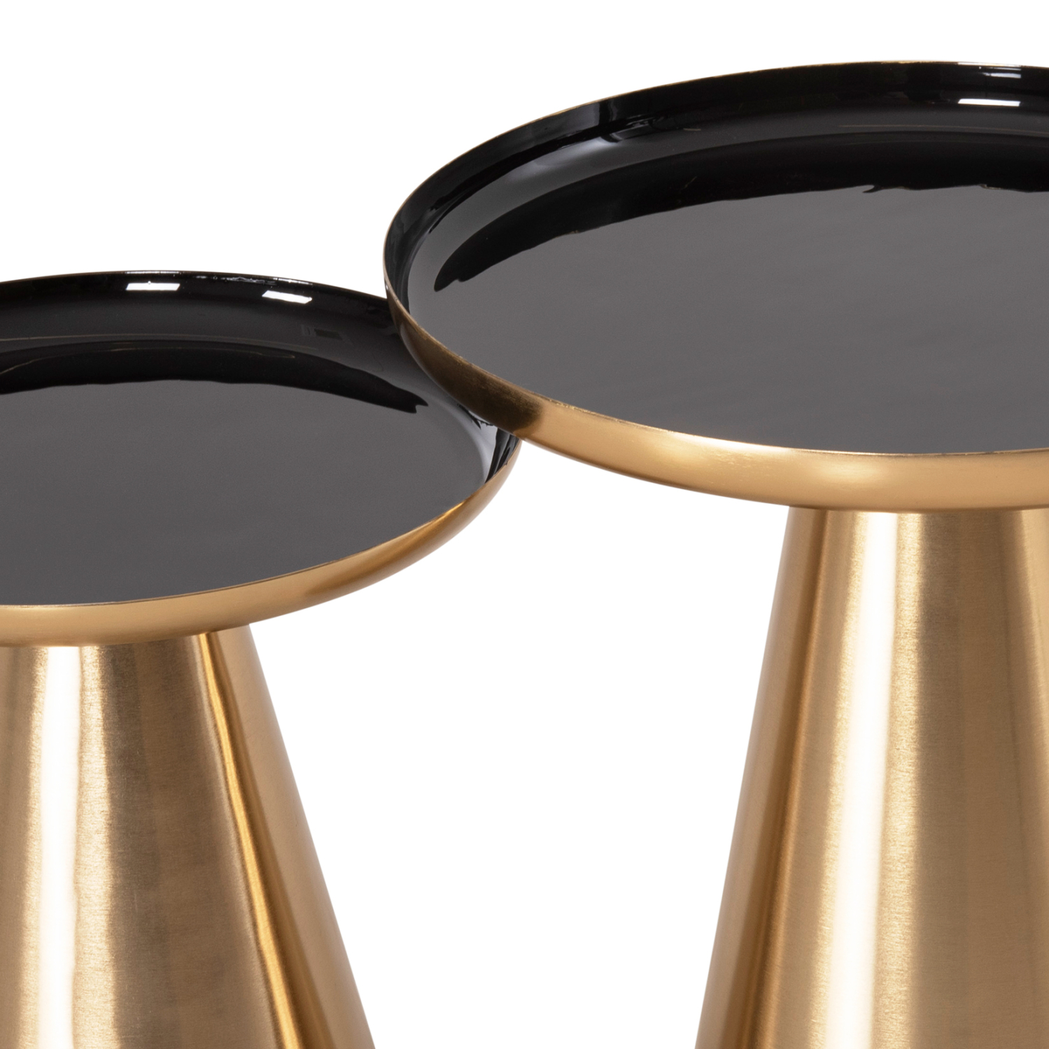 Το σετ 2 τραπεζιών OLUF για το σαλόνι είναι μια από τις νέες προσθήκες στην γκάμα μας. Πρόκειται για 2 μεταλλικά τραπεζάκια στρογγυλά με κωνική βάση σε ΧΡΥΣΟ γυαλιστερό χρώμα. Οι επιφάνειες είναι glossy ΜΑΥΡΕΣ και έχουν χρυσή περίμετρο. Ιδανικά τόσο για το σπίτι, όσο και για επαγγελματικούς χώρους.