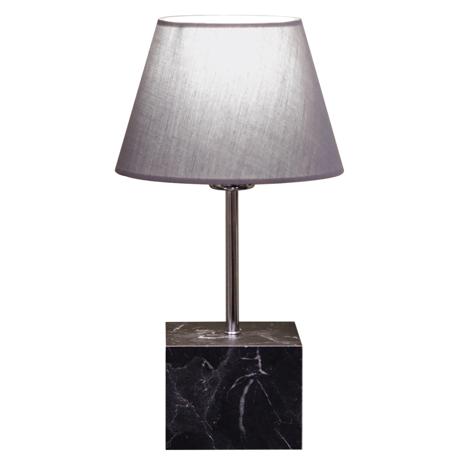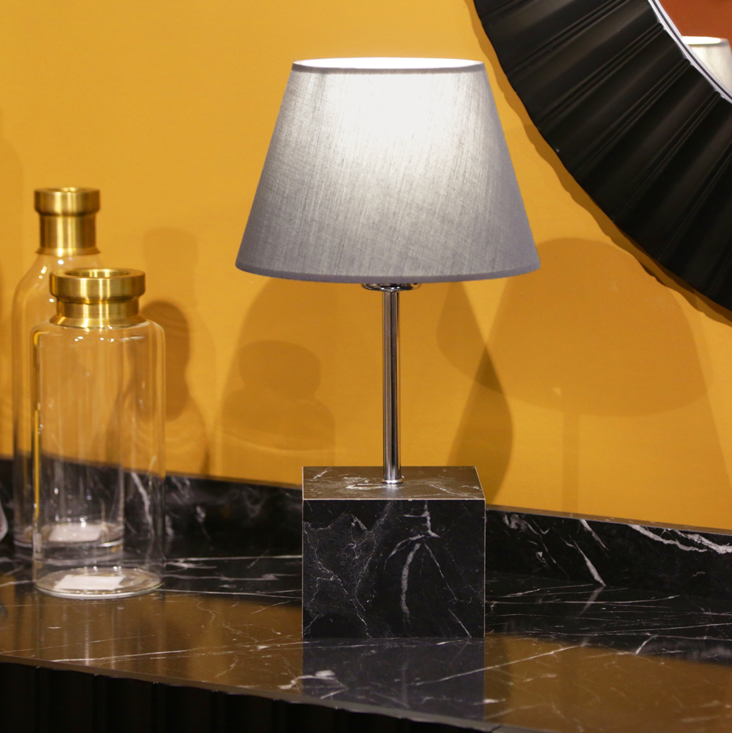 Επιτραπέζιο διακοσμητικό φωτιστικό με μονή κολώνα. Η βάση του φωτιστικού έχει το σχήμα κύβου με όψη ανθρακί μαρμάρου ενώ η κολώνα είναι σε χρυσό χρώμα. Το «καπέλο» έχει τραπεζοειδές κυκλικό σχήμα σε γκρι χρώμα. Το φως διαχέεται στον χώρο ευχάριστα και η αντανάκλασή του πάνω στην χρυσή κολωνίτσα του φωτιστικού αλλά και στην κυβική βάση, παιχνιδίζει ευχάριστα στο μάτι. Αυτού του είδους τα φωτιστικά δεν προορίζονται για φωτιστικά διαβάσματος και αυτό πρέπει πάντα να λαμβάνεται υπόψη κατά την επιλογή τους. Είναι καθαρά διακοσμητικά και το ταίριασμά τους με τον περιβάλλοντα χώρο θα πρέπει να είναι αρμονικό. Αυτό το φωτιστικό είναι κομψό και βολικό σε διαστάσεις παρέχοντας αμέτρητες δυνατότητες «δεσίματος» με την υπόλοιπη διακόσμησή σας. Είναι ένα μικρό έργο τέχνης.
